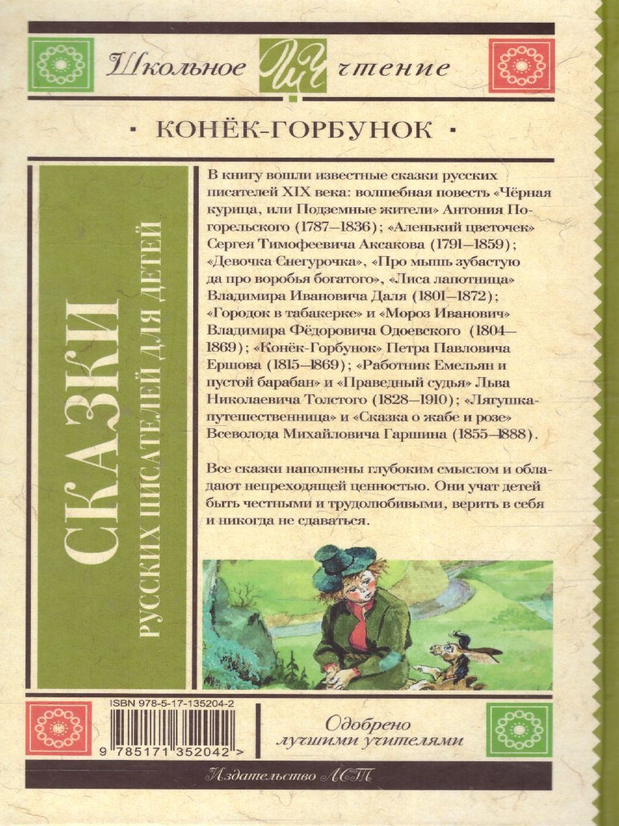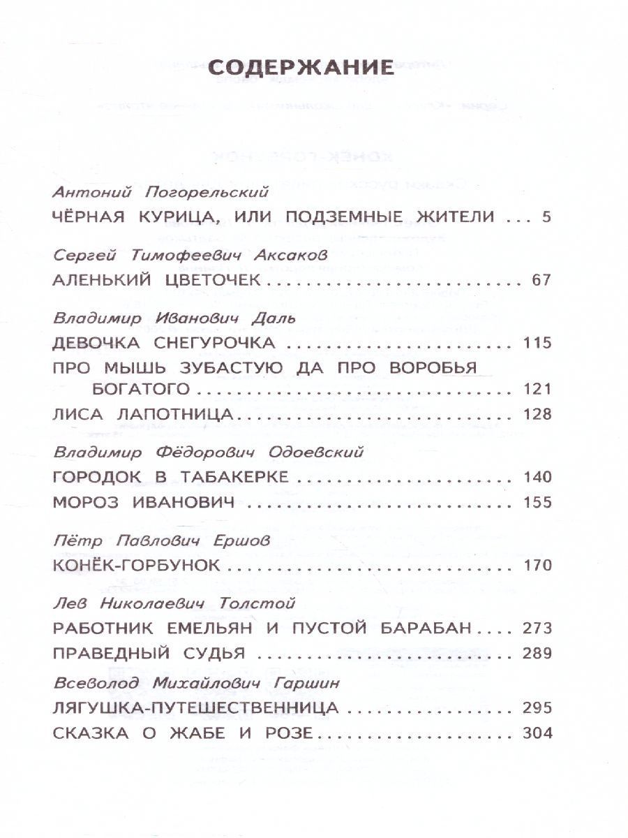 В книгу вошли известные сказки русских писателей XIX века: волшебная повесть "Чёрная курица, или Подземные жители" Антония Погорельского (1787-1836); "Аленький цветочек" Сергея Тимофеевича Аксакова (1791-1859); "Девочка Снегурочка", "Про мышь зубастую да про воробья богатого", "Лиса лапотница" Владимира Ивановича Даля (1801-1872); "Городок в табакерке" и "Мороз Иванович" Владимира Федоровича Одоевского (1804-1869); "Конёк-горбунок" Петра Павловича Ершова (1815-1869); "Работник Емельян и пустой барабан", "Праведный судья" Льва Николаевича Толстого (1828-1910); "Лягушка-путешественница" и "Сказка о жабе и розе" Всеволода Михайловича Гаршина (1855-1888). Все сказки наполнены глубоким смыслом и обладают непреходящей ценностью. Они учат детей быть честными и трудолюбивыми, верить в себя и никогда не сдаваться.Характеристики