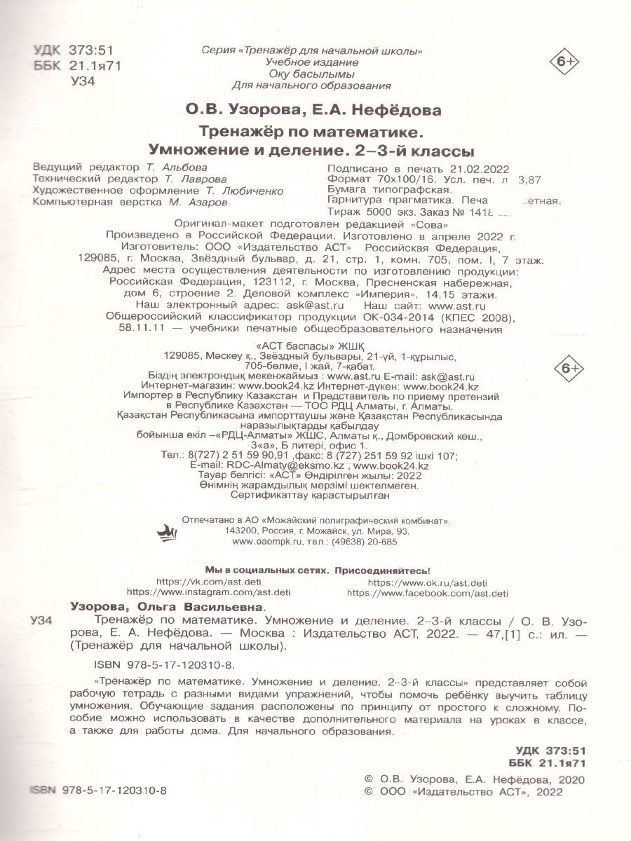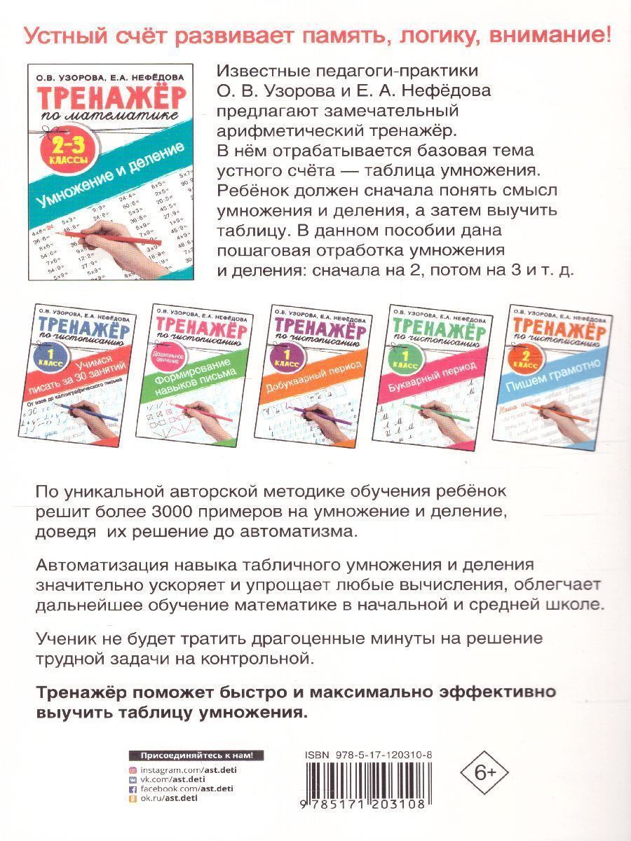 "Тренажер по математике. Умножение и деление. 2-3 классы" соответствует ФГОС для начальной школы. Его авторы — известные педагоги-практики О. В. Узорова и Е. А. Нефёдова. Высокоэффективный тренажёр представляет собой рабочую тетрадь с разными видами упражнений, чтобы помочь ребёнку выучить таблицу умножения. Обучающие задания расположены по принципу от простого к сложному. Использование в книге второго цвета ускорит процесс освоения учебного материала. Пособие можно использовать в качестве дополнительного материала на уроках в классе, а также для работы дома. Для начального образования.Характеристики