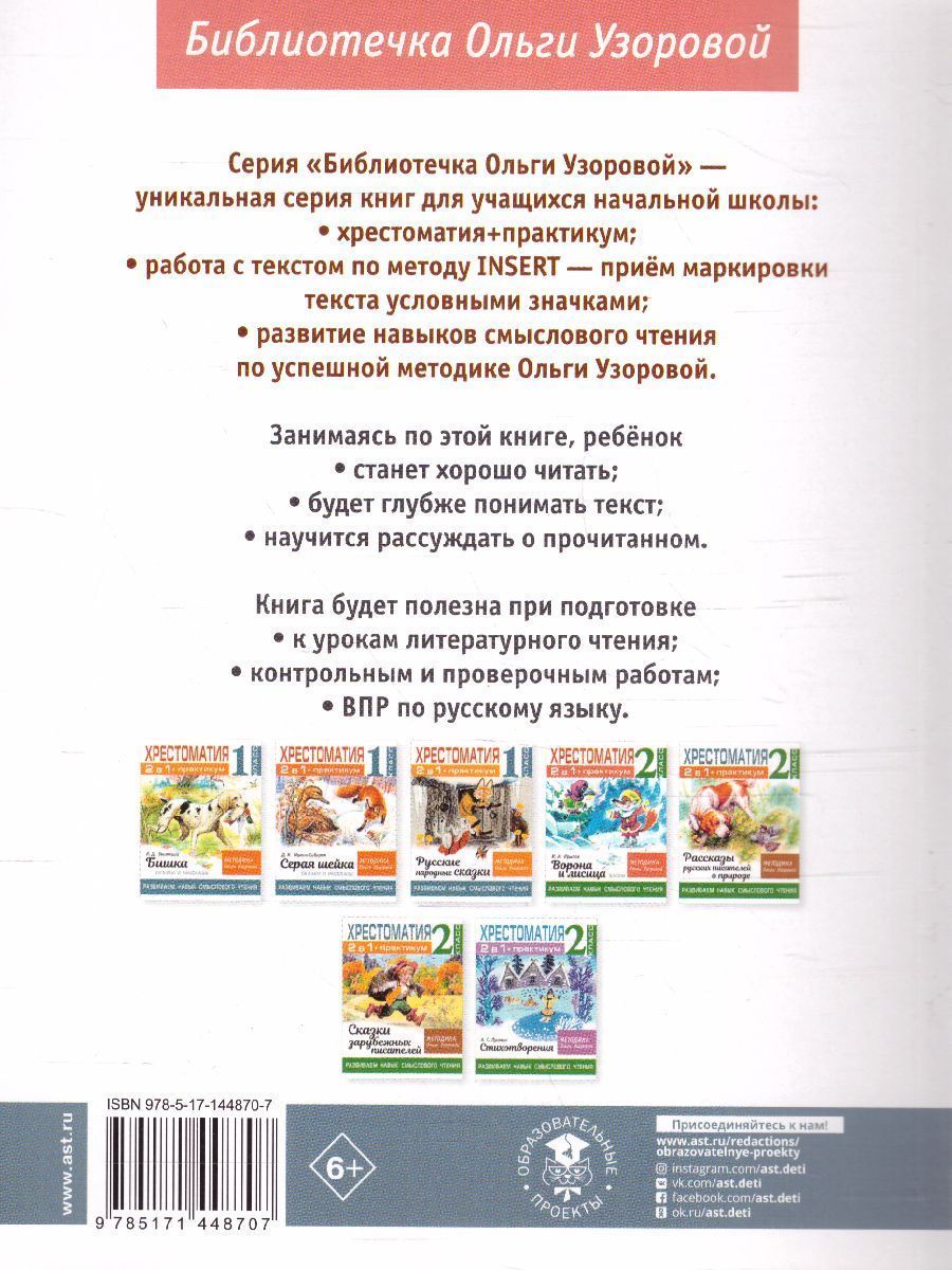 Пособие из серии «Библиотечка Ольги Узоровой» сочетает в себе хрестоматию, учебник, рабочую тетрадь. Для эффективного обучения ребёнка работе с текстом в пособии предлагается метод (INSERT) — приём маркировки текста условными значками. Кроме текста художественных произведений в книге дано полное методическое сопровождение, где детально объясняется как ребёнок должен работать с текстом. Работа с пособием разовьёт у учащихся начальной школы навыки смыслового чтения и грамотной работы с текстом художественного произведения. Эти навыки пригодятся им на уроках литературы, на контрольных работах, на ВПР по русскому языку в 4 классе, на государственной итоговой аттестации в старших классах. Для младшего школьного возраста.Характеристики