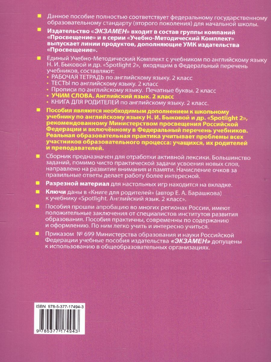 Английский язык 2 класс. Учим слова SPOTLIGHT (к новому ФПУ). ФГОС. УМК Быкова. Данное пособие полностью соответствует федеральному государственному образовательному стандарту (второго поколения) для начальной школы. Сборник включает в себя задания для запоминания активной лексики. Большинство заданий, помимо чисто практической задачи усвоения новых слов, направлено на развитие внимания и памяти. Разрезной материал для настольных игр находится на вкладке. Ключи даны в "Книге для родителей. 2 класс". Для учащихся 2 класса, изучающих английский язык по учебнику Н. И. Быковой и др. "Spotlight. Английский язык. 2 класс. В 2-х частях".Характеристики