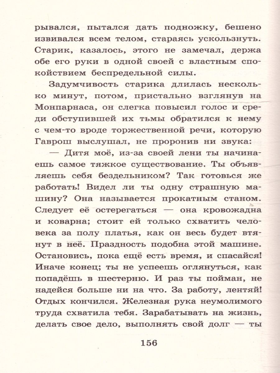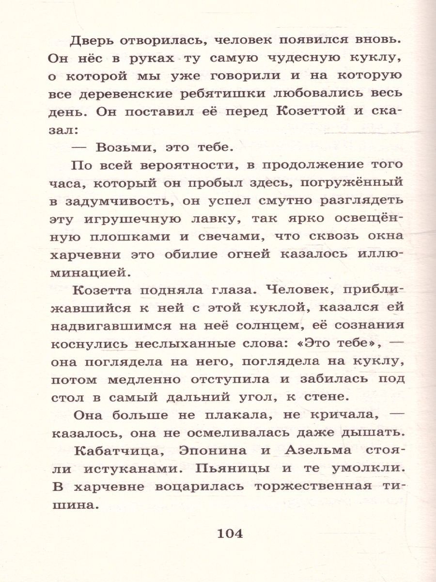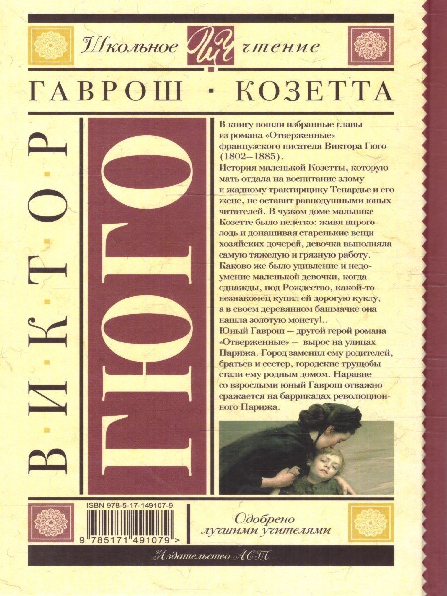 В книгу вошли избранные главы из романа "Отверженные" французского писателя Виктора Гюго (1802–1885). История маленькой Козетты, которую мать отдала на воспитание злому и жадному трактирщику Тенардье и его жене, не оставит равнодушными юных читателей. В чужом доме малышке Козетте было нелегко: живя впроголодь и донашивая старенькие вещи хозяйских дочерей, девочка выполняла самую тяжелую и грязную работу. Каково же было удивление и недоумение маленькой девочки, когда однажды, под Рождество, какой-то незнакомец купил ей дорогую куклу, а в своём деревянном башмачке, она нашла золотую монету!.. Юный Гаврош - другой герой романа "Отверженные" - вырос на улицах Парижа. Город заменил ему родителей, братьев и сестер, городские трущобы стали ему родным домом. Наравне со взрослыми , юный Гаврош отважно сражается на баррикадах революционного Парижа.Характеристики