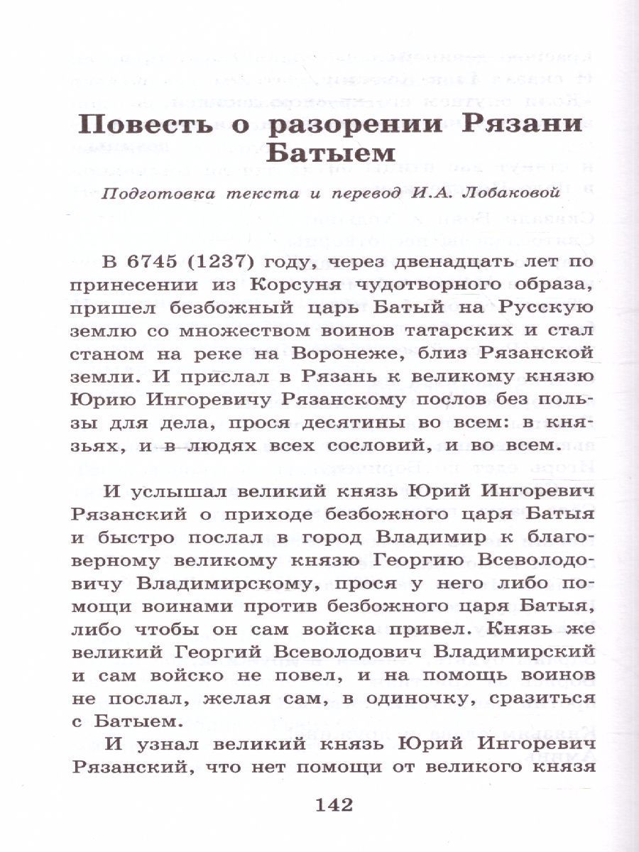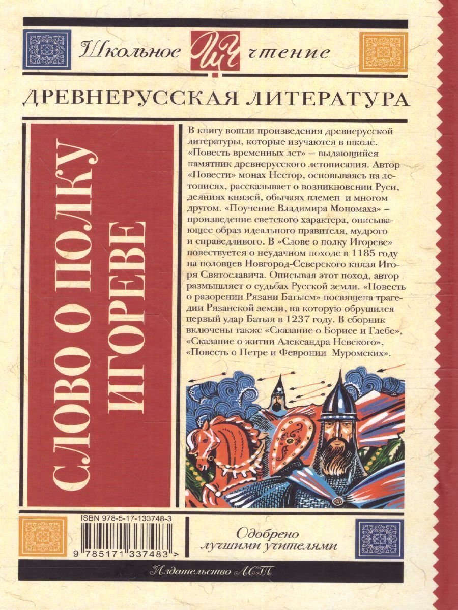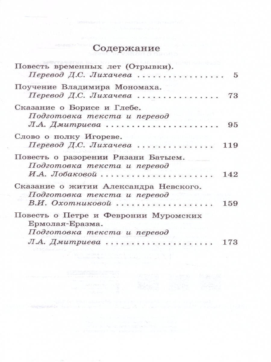 В книгу вошли произведения древнерусской литературы, которые изучаются в школе. «Повесть временных лет»– выдающийся памятник древнерусского летописания, сохранившаяся в составе более поздних летописных сводов. Автор повести монах Нестор, основываясь на летописях, рассказывает о возникновении Руси, деяниях князей, обычаях племен и многом другом. «Поучение» Владимира Мономаха – произведение светского характера, описывающее образ идеального правителя, мудрого и справедливого. В «Слове о полку Игореве» повествуется о неудачном походе в 1185 году на половцев Новгород-Северского князя Игоря Святославича. Описывая этот поход, автор размышляет о судьбах Русской земли. «Повесть о разорении Рязани Батыем» посвящена трагедии Рязанской земли, на которую обрушился первый удар Батыя в 1237 году. В сборник включены также «Сказание о Борисе и Глебе", «Сказание о житии Александра Невского», «Повесть о Петре и Февронии Муромских».Характеристики