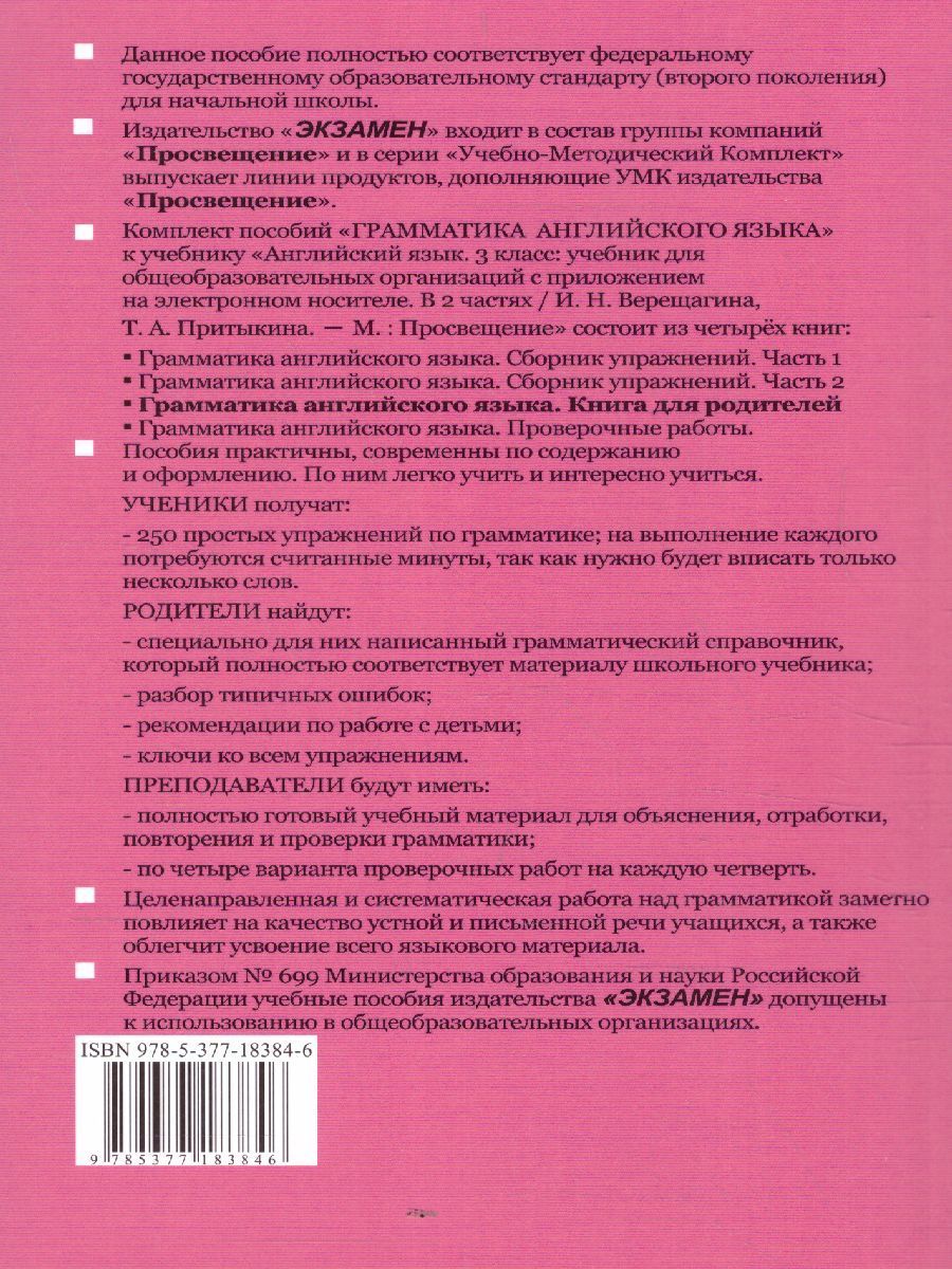 Английский язык 3 класс. Грамматика. Книга для родителей. Оранжевый (3-й год). ФГОС. Данное пособие полностью соответствует федеральному государственному образовательному стандарту (второго поколения) для начальной школы. Оно представляет собой третий компонент учебного комплекта, состоящего из четырёх книг: Грамматика английского языка. Сборник упражнений. Часть 1 -Грамматика английского языка. Сборник упражнений. Часть 2 -Грамматика английского языка. Книга для родителей -Грамматика английского языка. Проверочные работы. Книга содержит объяснение всех грамматических правил, которые изучаются в 3 классассе, разбор типичных грамматических ошибок и рекомендации по работе над грамматикой. В конце книги находятся классючи к упражнениям из Сборника. Для родителей, чьи дети изучают язык по учебнику И. Н. Верещагиной, Т. А. Притыкиной "Английский язык. 3 класс. В 2-х частях".Характеристики