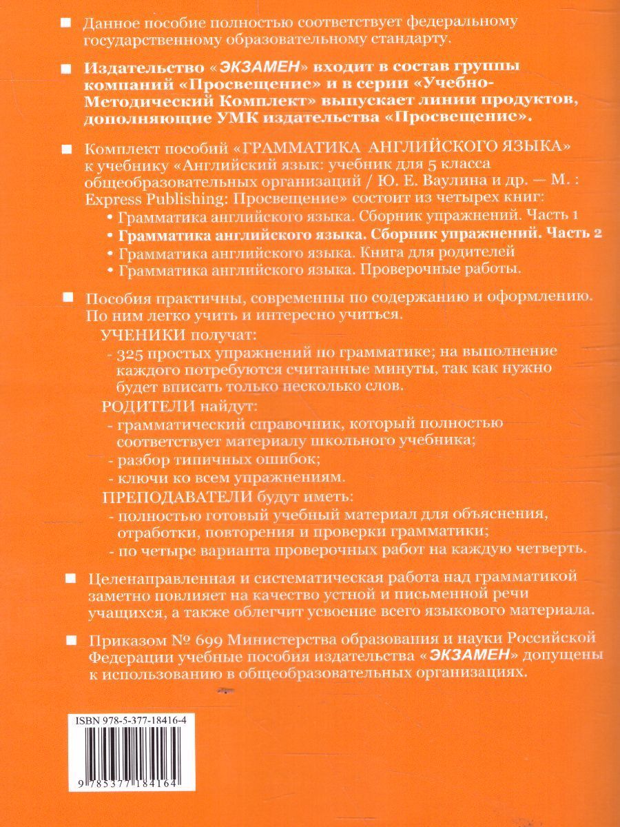 Английский язык 5 класс. Сборник упражнений к учебнику Ю. Ваулиной. В 2 частях. Часть 2. ФГОС. Данное пособие полностью соответствует федеральному государственному образовательному стандарту (второго поколения). Оно представляет собой первую часть учебного комплекта, состоящего из четырёх книг:- Грамматика английского языка. Сборник упражнений. Часть 1- Грамматика английского языка. Сборник упражнений. Часть 2- Грамматика английского языка. Книга для родителей- Грамматика английского языка. Проверочные работы.Пособие содержит 325 грамматических упражнений, обеспечивающих усвоение и закрепление правил грамматики, которые изучаются в 5 классе. Характер упражнений позволяет выполнять их максимально быстро, что экономит силы и время учащихся и помогает в короткие сроки добиться хорошего знания грамматики.Для учащихся 5 класса, изучающих английский язык по учебнику Ю. Е. Ваулиной и др. "Английский язык. 5 класс".3-е издание, переработанное и дополненное.Характеристики