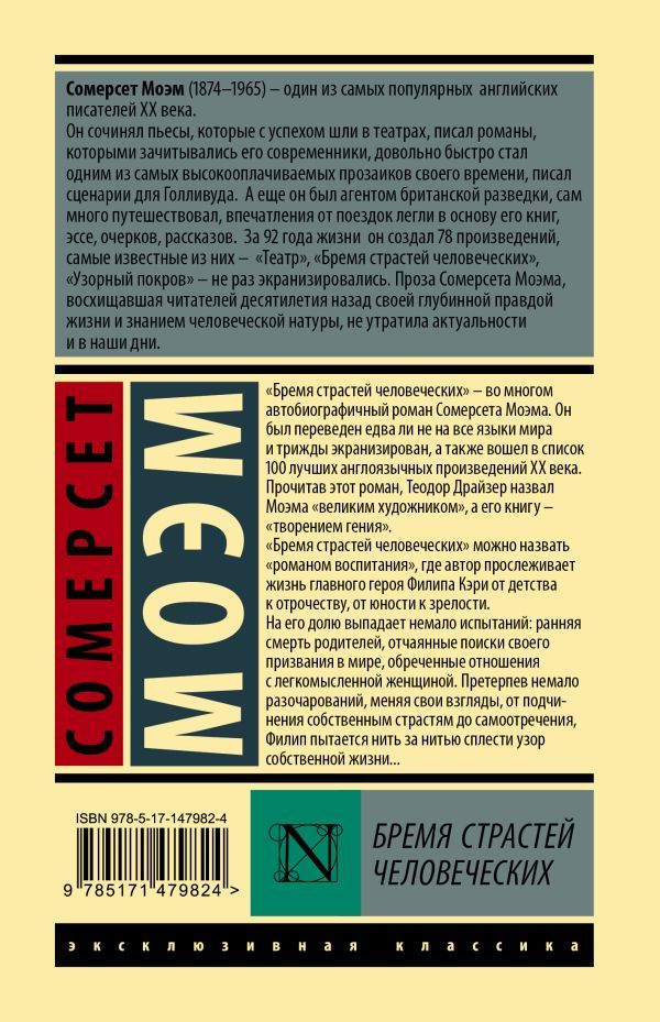 "Бремя страстей человеческих" — во многом автобиографичный роман Сомерсета Моэма. Он был переведен едва ли не на все языки мира и трижды экранизирован, а также вошел в список 100 лучших англоязычных произведений XX века. Прочитав этот роман, Теодор Драйзер назвал Моэма "великим художником", а его книгу — "творением гения". "Бремя страстей человеческих" можно назвать "романом воспитания", где автор прослеживает жизнь главного героя Филипа Кэри от детства к отрочеству, от юности к зрелости. На его долю выпадает немало испытаний: ранняя смерть родителей, отчаянные поиски своего призвания в мире, обреченные отношения с легкомысленной женщиной. Претерпев немало разочарований, меняя свои взгляды, от подчинения собственным страстям до самоотречения, Филип пытается нить за нитью сплести узор собственной жизни…Характеристики