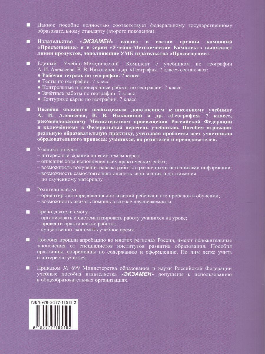 География 7 класс. Рабочая тетрадь к учебнику А.И. Алексеева, В.В. Николиной. УМК. ФГОС. Данное пособие полностью соответствует федеральному государственному образовательному стандарту (второго поколения).Предлагаемое пособие вклассючает разнообразные виды заданий, направленные на развитие познавательного интереса учащихся, повышение мотивации к обучению, отработке предметных и метапредметных умений и навыков. В рабочую тетрадь вклассючены необходимые контурные карты и задания по работе с ними. Особый раздел составляет проектно-исследовательский блок, реализующий практико-ориентированную составляющую курса географии, а также рефлексивно-оценочный блок, помогающий определить успехи в обучении. В пособии представлены все практические работы, предусмотренные программой, даны алгоритмы и методика их выполнения.Рабочая тетрадь предназначена к использованию как на уроке, так и дома для выполнения домашних заданий.Приказом № 699 Министерства образования и науки Российской Федерации учебные пособия издательства "Экзамен" допущены к использованию в общеобразовательных организациях.Характеристики