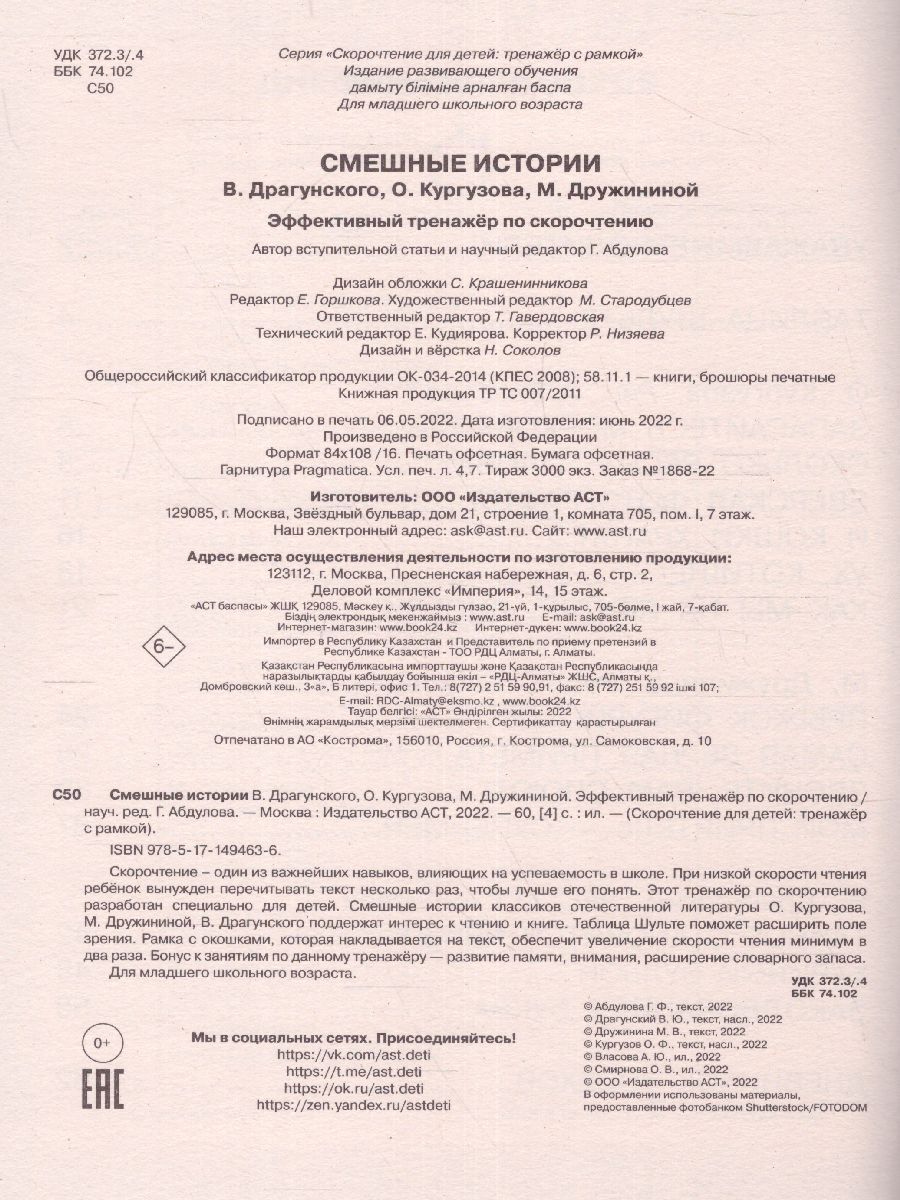 Скорочтение – один из важнейших навыков, влияющих на успеваемость в школе. При низкой скорости чтения ребёнок вынужден перечитывать текст несколько раз, чтобы лучше его понять. Этот тренажёр по скорочтению разработан специально для детей. Смешные истории классиков отечественной литературы О. Кургузова, М. Дружининой, В. Драгунского поддержат интерес к чтению и книге. Таблица Шульте поможет расширить поле зрения. Рамка с окошками, которая накладывается на текст, обеспечит увеличение скорости чтения минимум в два раза. Бонус к занятиям по данному тренажёру — развивает памяти, внимания, расширение словарного запаса. Для младшего школьного возраста.Характеристики