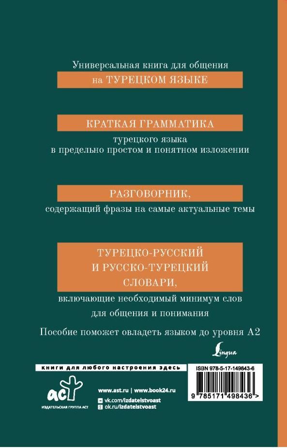В издании "Турецкий язык. 4 книги в одной: грамматика, разговорник, турецко-русский словарь, русско-турецкий словарь" собранны самые важные материалы для изучения иностранного языка: базовый объем грамматики для изучения, разговорник, с помощью которого можно легко научиться применять грамматические правила на практике и улучшить разговорную речь, турецко-русский и русско-турецкий словари, содержащие самые употребительные слова и словосочетания. Формат книги оптимально подходит для того, чтобы брать его с собой в поездки или на занятия в качестве справочного издания. "Турецкий язык. 4 книги в одной: грамматика, разговорник, турецко-русский словарь, русско-турецкий словарь" подойдет для начинающих изучать язык, а также для уровня владения языком А1, А2.Характеристики
