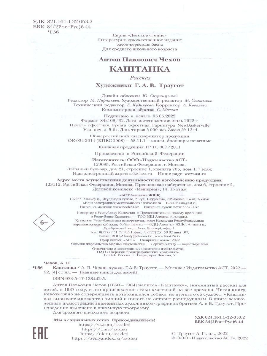 Антон Павлович Чехов (1860–1904) написал «Каштанку», знаменитый рассказ для детей, в 1887 году, и это произведение стало классикой на все времена. Читая книгу, невозможно не сопереживать потерявшейся собаке, не думать о её судьбе и найдётся ли хозяин… «Каштанка» вызывает множество эмоций и никого не оставит равнодушным. В книге великолепные иллюстрации знаменитых художников-графиков братьев А. и В. Траугот. Произведение включено в школьную программу. Для среднего школьного возраста.Характеристики