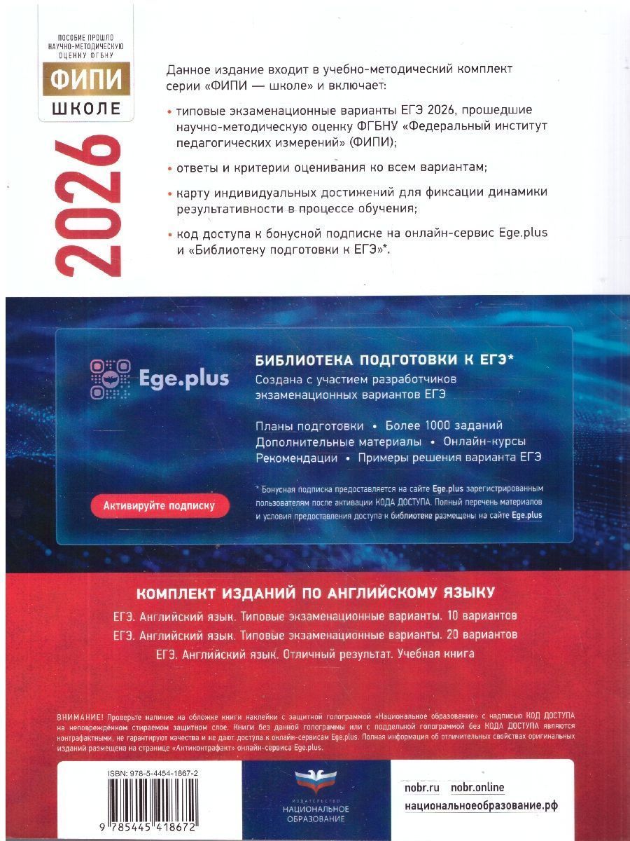Серия подготовлена разработчиками контрольных измерительных материалов (КИМ) единого государственного экзамена. В сборнике представлены: 20 типовых экзаменационных вариантов, составленных в соответствии с проектом демоверсии КИМ ЕГЭ по английскому языку 2026 года; задания устной части; инструкции по выполнению экзаменационной работы (письменная и устная части); ответы ко всем заданиям; критерии оценивания. Выполнение заданий типовых экзаменационных вариантов предоставляет обучающимся возможность самостоятельно подготовиться к государственной итоговой аттестации в форме ЕГЭ, а также объективно оценить уровень своей подготовки к экзамену. Учителя могут использовать типовые экзаменационные варианты для организации контроля результатов освоения школьниками образовательных программ среднего общего образования и интенсивной подготовки обучающихся к ЕГЭ.Характеристики