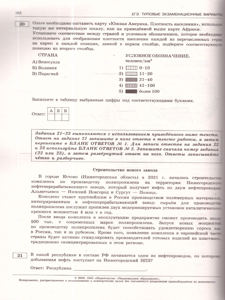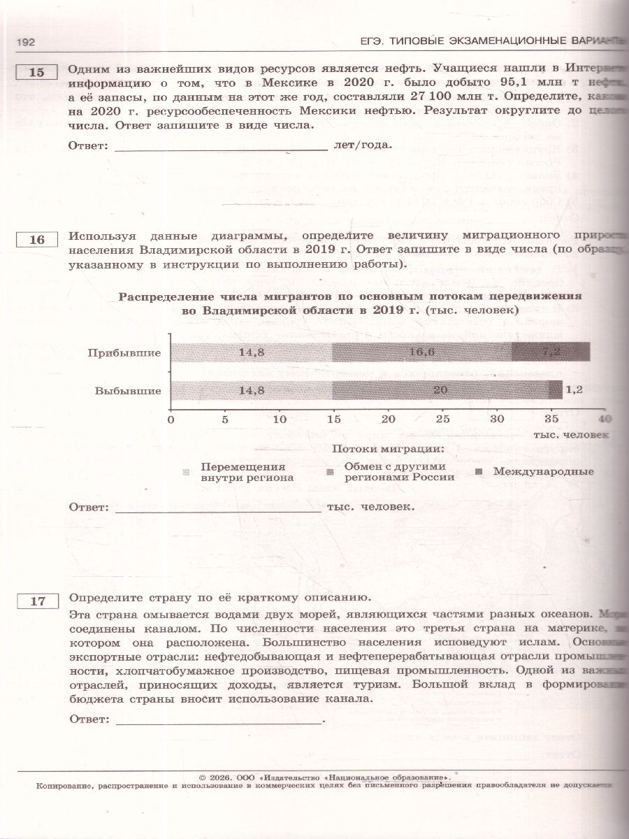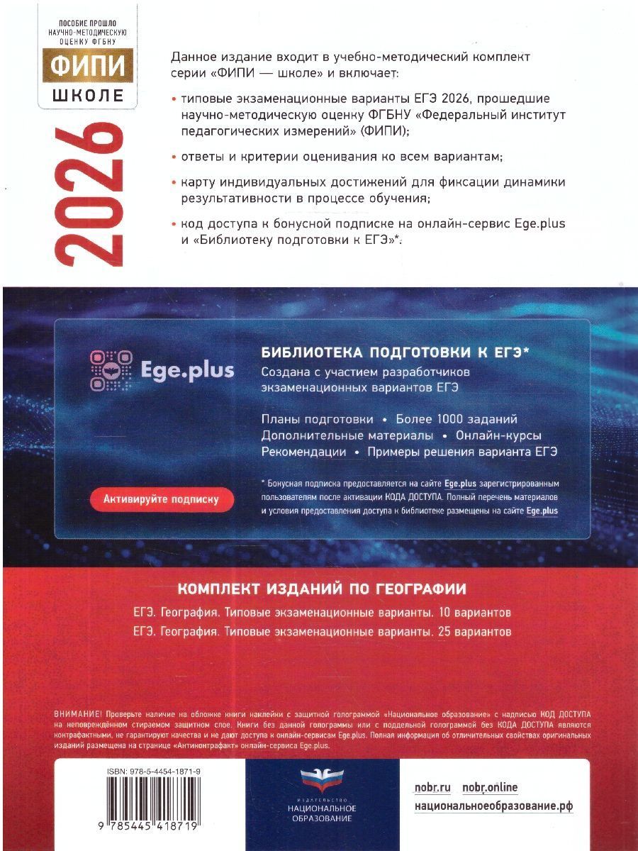 Серия подготовлена разработчиками контрольных измерительных материалов (КИМ) единого государственного экзамена. В сборнике представлены: 20 типовых экзаменационных вариантов, составленных в соответствии с проектом демоверсии КИМ ЕГЭ по географии 2026 года; инструкция по выполнению экзаменационной работы; ответы ко всем заданиям; критерии оценивания. Выполнение заданий типовых экзаменационных вариантов предоставляет обучающимся возможность самостоятельно подготовиться к государственной итоговой аттестации в форме ЕГЭ, а также объективно оценить уровень своей подготовки к экзамену. Учителя могут использовать тематические и типовые экзаменационные варианты для организации контроля результатов освоения школьниками образовательных программ среднего общего образования и интенсивной подготовки обучающихся к ЕГЭ.Характеристики