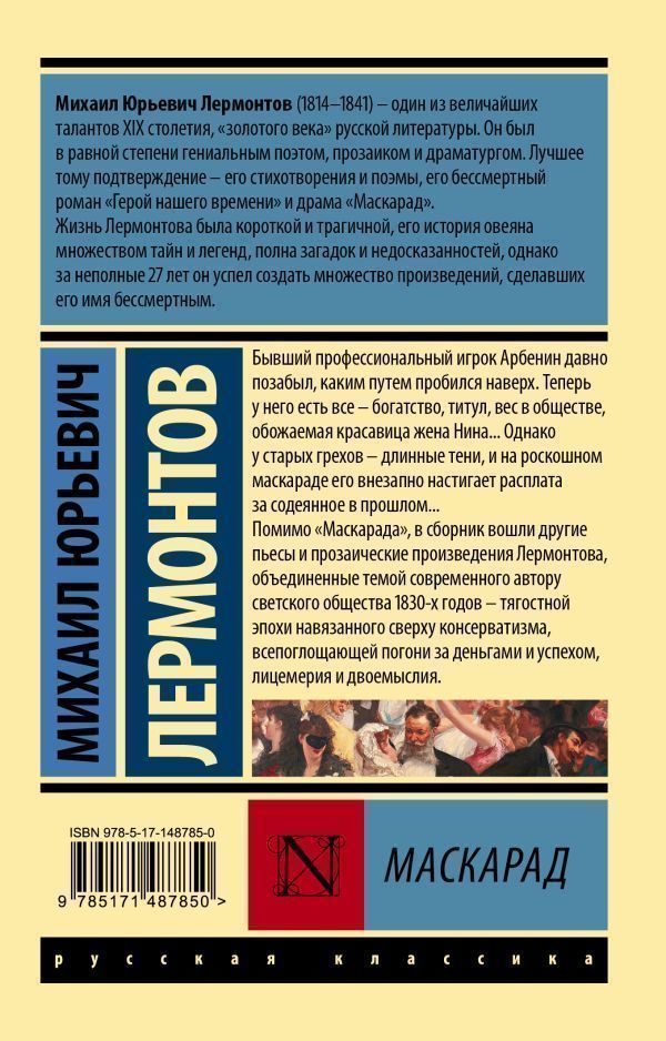 Бывший профессиональный игрок Арбенин давно позабыл, каким путем пробился наверх. Теперь у него есть все — богатство, титул, вес в обществе, обожаемая красавица‑жена Нина... однако у старых грехов — длинные тени, и на роскошном маскараде его внезапно настигает расплата за содеянное в прошлом... Помимо "Маскарада, в сборник вошли другие пьесы и прозаические произведения Лермонтова, объединенные темой современного автору светского общества 1830‑х годов — тягостной эпохи навязанного сверху консерватизма, всепоглощающей погони за деньгами и успехом, лицемерия и двоемыслия.Характеристики