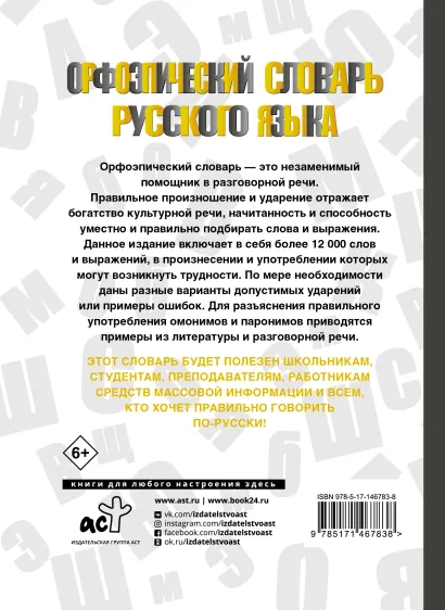 Орфоэпический словарь русского языка поможет правильно расставлять ударение в словах, вызывающих сомнение, повысить грамотность и уровень речевой культуры. Издание содержит более 12 000 слов и выражений, в том числе устаревающих и устаревших, с расстановкой ударения согласно актуальным нормам языка. Слова сопровождаются вариантами допустимых ударений, в том числе запретительными примерами, а также литературные и исторические справки об изменении нормы. У изменяемых слов даются формы, вызывающие трудности в постановке ударения. Омонимы и паронимы сопровождаются толкованиями и примерами для разъяснения правильного употребления. Данное издание будет полезно всем, кто хочет говорить и писать правильно, а также тем, чья учебная и профессиональная деятельность требует высокого уровня грамотности.Характеристики