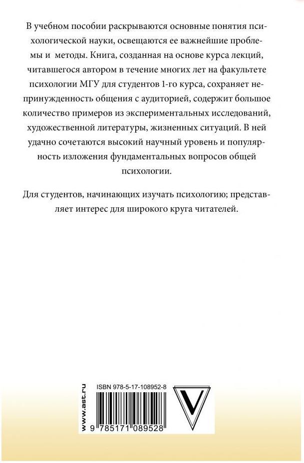 В учебном пособии раскрываются основные понятия психологической науки, освещаются ее важнейшие проблемы и методы. Книга, созданная на основе курса лекций, читавшегося автором в течение многих лет на факультете психологии МГУ для студентов 1‑го курса, сохраняет непринужденность общения с аудиторией, содержит большое количество примеров из экспериментальных исследований, художественной литературы, жизненных ситуаций. В ней удачно сочетаются высокий научный уровень и популярность изложения фундаментальных вопросов общей психологии. Для студентов, начинающих изучать психологию; представляет интерес для широкого круга читателей.Характеристики