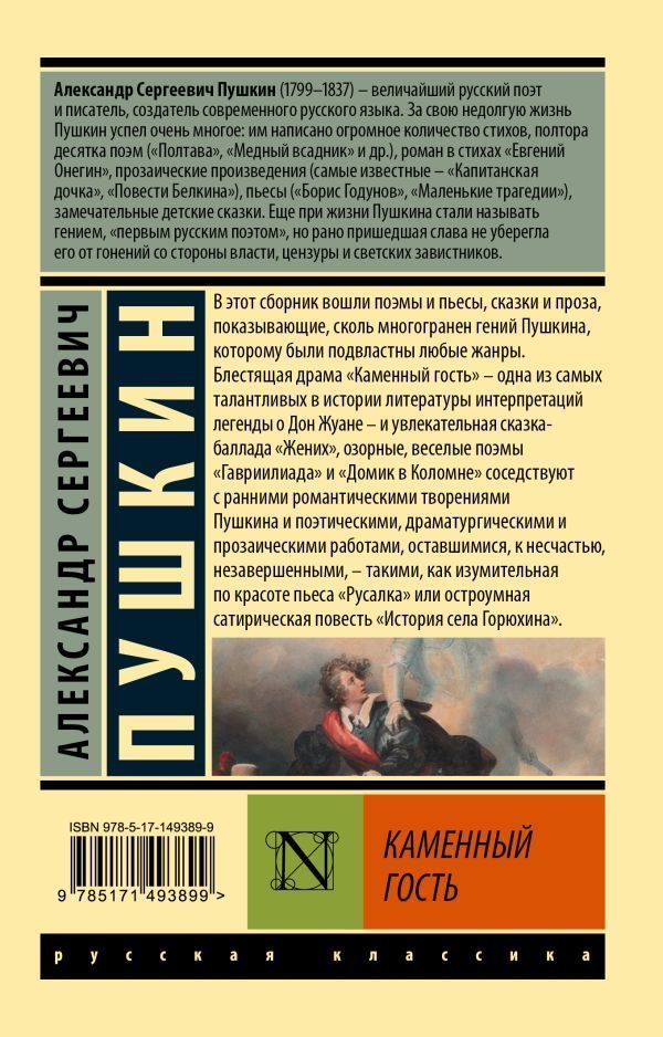 В этот сборник вошли поэмы и пьесы, сказки и проза, показывающие сколь многогранен гений Пушкина, которому были подвластны любые жанры. Блестящая драма "Каменный гость" — одна из самых талантливых в истории литературы интерпретаций легенды о Дон Жуане — и увлекательная сказка-баллада "Жених", озорные, веселые поэмы "Гавриилиада" и "Домик в Коломне" соседствуют с ранними романтическими творениями Пушкина и поэтическими, драматургическими и прозаическими работами, оставшимися, к несчастью, незавершенными, — такими, как изумительная по красоте пьеса "Русалка" или остроумная сатирическая "История села Горюхина".Характеристики