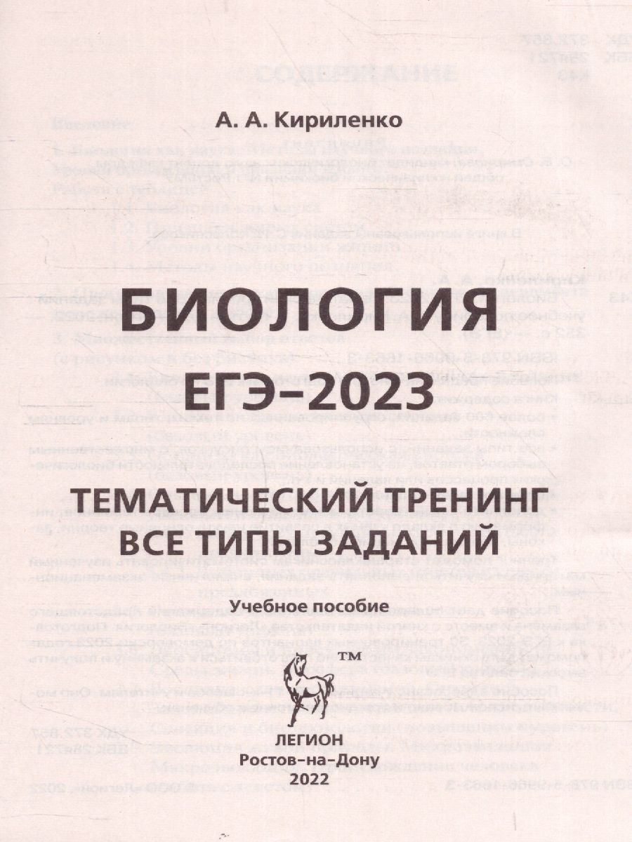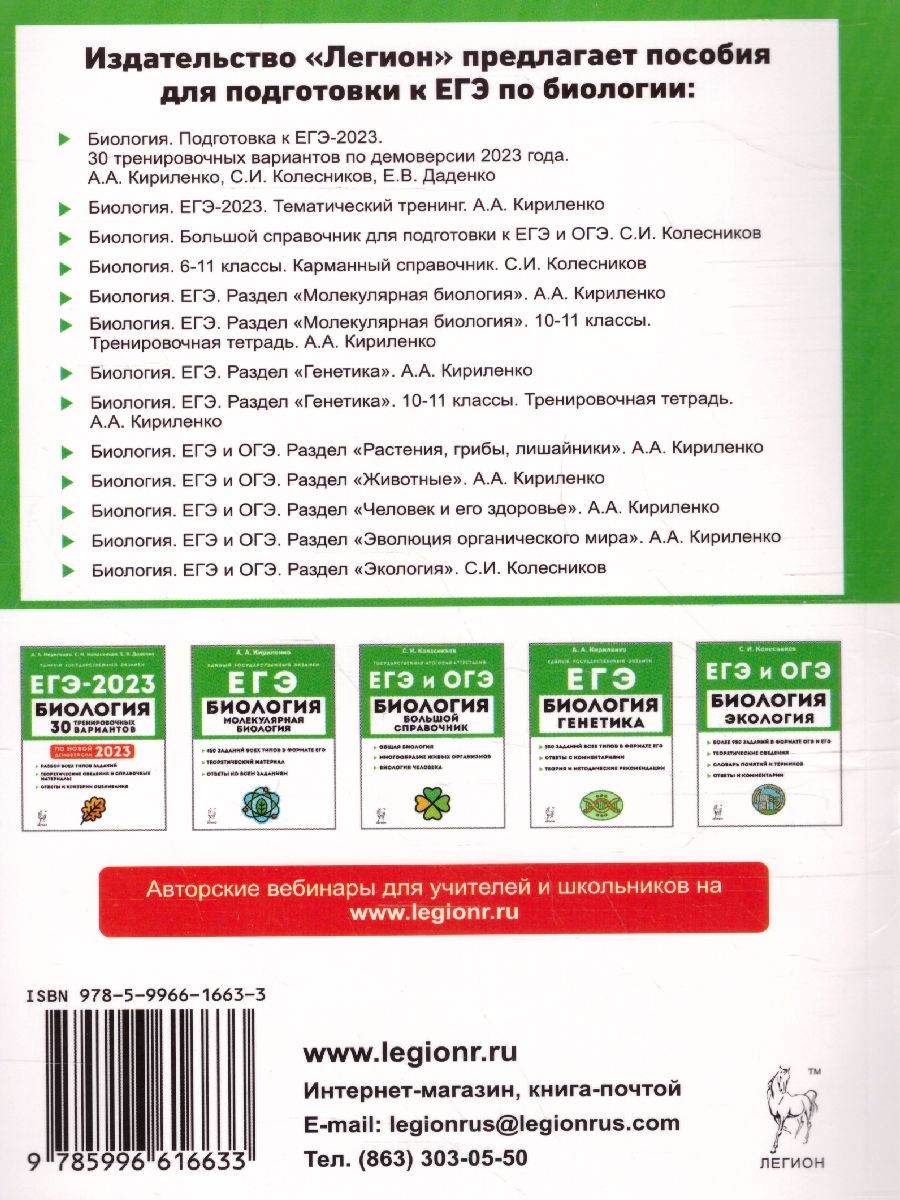 ЕГЭ-2023 Биология 10-11 классы. Тематический тренинг. Пособие предназначено для подготовки к ЕГЭ по биологии. Книга содержит: более 600 заданий, сгруппированных по темам, типам и уровням сложности: все типы заданий: с использованием рисунков, с множественным выбором ответов, на установление последовательности биологических процессов или явлений и т. п.: ответы ко всем заданиям: дополнительный теоретический материал: словарь терминов: информацию о вкладе учёных в развитие науки: основные теории, законы, правила и принципы биологии. Тренинг поможет старшеклассникам систематизировать изученный материал и научиться выполнять задания, аналогичные экзаменационным. Пособие даёт полное представление о содержании предстоящего экзамена и вместе с книгой издательства "Легион" "Биология. Подготовка к ЕГЭ-2023. 30 тренировочных вариантов по демоверсии 2023 года поможет выпускникам качественно подготовиться к экзамену и получить высокий балл на ЕГЭ. Пособие адресовано учащимся 10-11-х классов и учителям. Оно может быть использовано и при дистанционном обучении.Характеристики