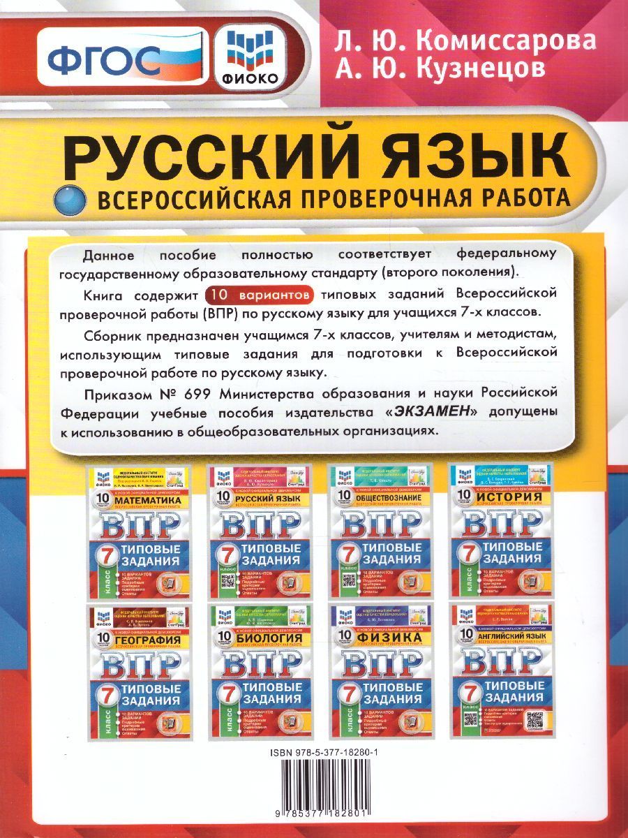 ВПР Русский язык 7 класс. 10 вариантов ФИОКО СТАТГРАД ТЗ. ФГОС