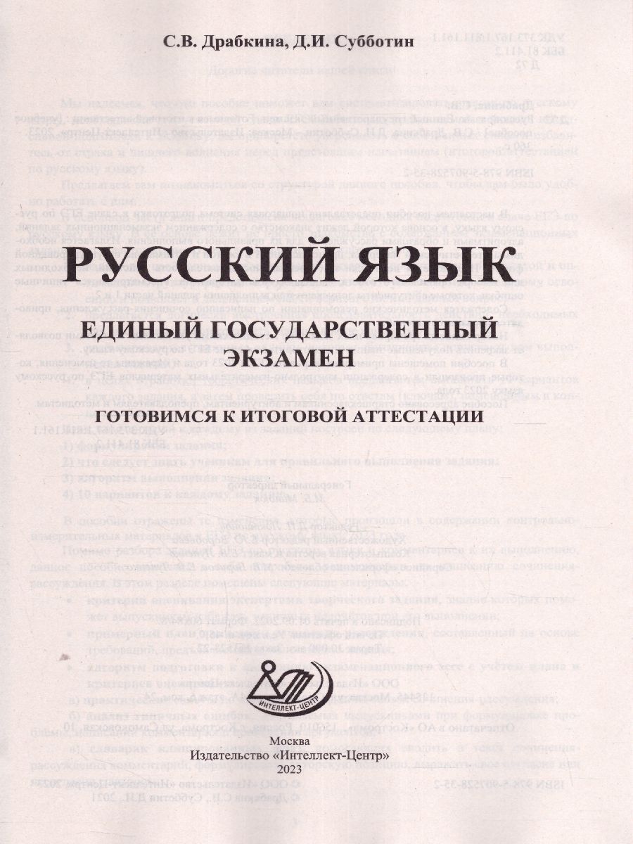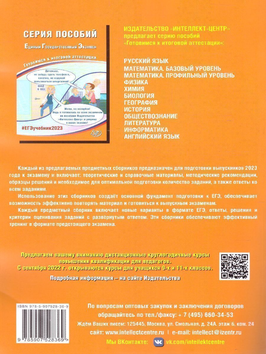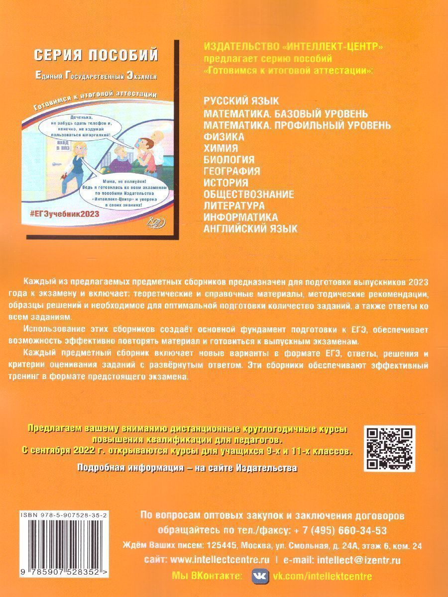 Комплект пособий для подготовки к ЕГЭ. Данные пособия предназначены для подготовки к Единому государственному экзамену по математике и русскому языку. Издания включают типовые задания по всем содержательным линиям экзаменационной работы, а также 30 примерных вариантов в формате ЕГЭ 2023 года по математике.Пособие поможет школьникам проверить свои знания и умения по предметам, а учителям - оценить степень достижения требований образовательных стандартов отдельными учащимися и обеспечить их целенаправленную подготовку к экзамену. В пособии помещены примерные варианты ЕГЭ 2023 г.Характеристики