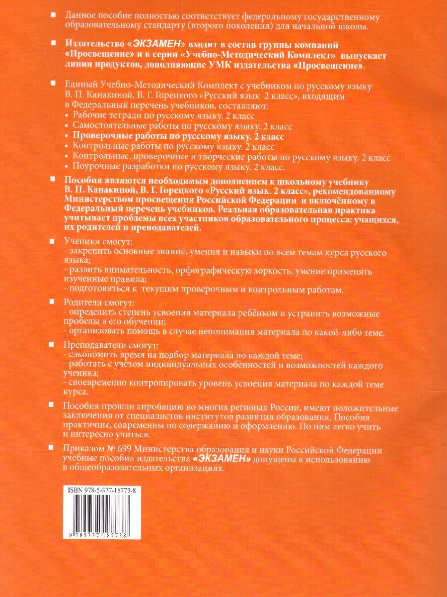Русский язык 2 класс. Проверочные работы к учебнику В. П. Канакиной, В. Г. Горецкого. Данное пособие полностью соответствует федеральному государственному образовательному стандарту (второго поколения) для начальной школы. Пособие направлено на проверку, отработку и закрепление знаний по всем темам курса "Русский язык. 2 класс". Занимаясь по данному пособию, дети будут заполнять таблицы, выбирать ответы в тестовых заданиях, вставлять пропущенные буквы и исправлять специально допущенные ошибки, классифицировать слова и словосочетания, составлять предложения и тексты. Такая работа поможет школьникам в течение всего учебного времени не забывать пройденный материал. 2023 год, 5-е издание, переработанное и дополненное.Характеристики
