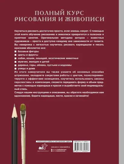 Научиться рисовать достаточно просто, если знаешь секрет. С помощью этой книги обучение рисованию и живописи превратится в полезное и приятное занятие. Оригинальная методика авторов – известных художников – проста и доступна каждому вне зависимости от таланта. Вы наверняка с легкостью научитесь рисовать карандашом и писать красками абсолютно все: · базовые фигуры · цветы и фрукты · собак, кошек, лошадей, экзотических животных · мужчин, женщин и детей · деревья, горы, облака, пустыни и водоемы · улицы и дома Из этого самоучителя вы также узнаете об основных способах штриховки, овладеете секретами работы с цветом, поэкспериментируете с эффектами освещения, научитесь использовать законы перспективы и композиции, сможете передавать форму и объем предметов с помощью карандаша и красок и выработаете свой индивидуальный стиль. Следуя нашим инструкциям и описаниям, вы обретете необходимое вам вдохновение. Берите карандаши, кисти, краски и начинайте!Характеристики