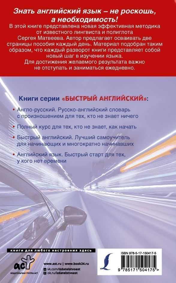 Матвеев Сергей Александрович — самый продаваемый автор в нише иностранных языков, полиглот, автор уникальной методики обучения языкам. Книга предназначена для тех, кто только начинает изучать английский язык. С помощью данного пособия вы освоите все правила произношения, разберете основные части речи и базовые грамматические конструкции, запомните много новых слов. Вы сможете освоить английский язык уровней А1–А2 за минимум времени. В этой книге автор предлагает изучать по две страницы пособия каждый день. Материал подобран таким образом, что каждый разворот книги представляет собой новый шаг в изучении языка. Для достижения желаемого результата важно не отступать и заниматься ежедневно. Динамичный, современный дизайн книги и великолепное качество бумаги будут радовать вас на протяжении всего курса обучения.Характеристики