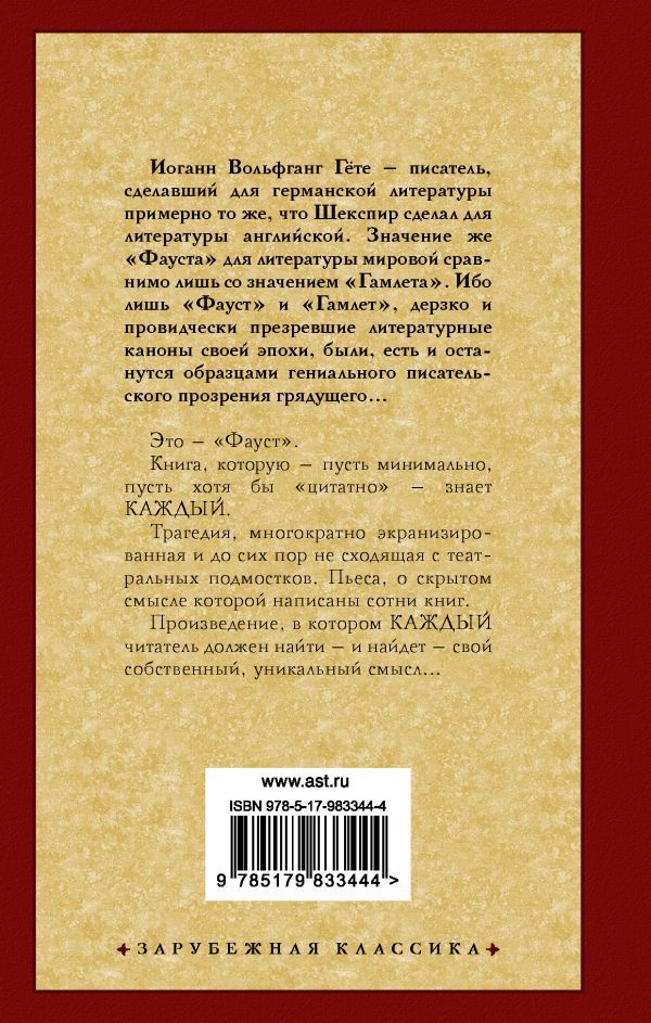 Это — "Фауст". Книга, которую — пусть минимально, пусть хотя бы "цитатно" — знает КАЖДЫЙ. Трагедия, многократно экранизированная и до сих пор не сходящая с театральных подмостков. Пьеса, о скрытом смысле которой написаны сотни книг. Произведение, в котором КАЖДЫЙ читатель должен найти — и найдет — свой собственный, уникальный смысл…Характеристики