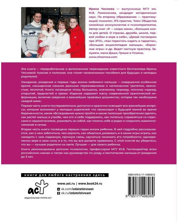 Ожидание, рождение и первые годы жизни любимого малыша — совершенно особенное время, насыщенное самыми разными переживаниями и наполненное трепетом, нежностью, теплотой. Эта книга посвящена этому большому, значимому периоду, полному надежд, открытий, трудностей и тревог. Она содержит массу современной практической информации, которая так необходима каждой маме. Первая часть книги доступно и красочно освещает все важнейшие вопросы, которые возникают у молодых родителей: что происходит с будущей мамой во время беременности, какие обследования нужно пройти и какие полезные приобретения сделать, как растет малыш в утробе, чем его и себя поддержать, как питаться, справляться со стрессами и недомоганиями, ухаживать за собой, как помочь себе в родах и сохранить взаимопонимание в семье. Вторая часть книги посвящена первым годам жизни ребенка. В ней подробно рассказывается, как о нем заботиться, чем кормить, как общаться, развивать и в какие игры играть, как наладить с ним надежную, прочную связь, научиться понимать его потребности, одновременно веря в свои силы и в то, что вы все делаете правильно. С этой книгой вы убедитесь, что вы — лучшие родители на свете. Лучшие — для своего ребенка.Характеристики
