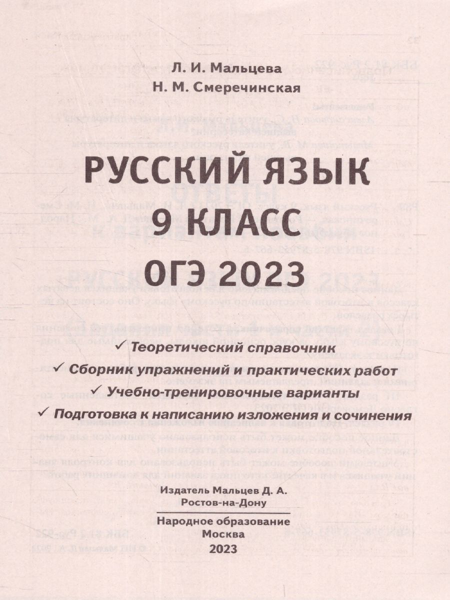 ОГЭ 2023 Русский язык. 30 вариантов. Данное пособие предназначено для подготовки учащихся девятых классов к итоговой аттестации по русскому языку. Оно состоит из четырёх разделов: I раздел. Краткий справочник, в котором приведены все сведения по русскому языку за курс основной школы, необходимые для подготовки к экзамену: II раздел. Сборник упражнений и практических работ, содержащий комментарии и тесно связанный по содержанию с заданиями, включёнными в варианты итоговой экзаменационной работы: III раздел. Учебно-тренировочные варианты, составленные согласно Демоверсии ОГЭ 2023: IV раздел. Подготовка к написанию изложения и сочинения. Также к пособию прилагается отдельная брошюра с ответами. Данное пособие может быть использовано учащимися для самостоятельной подготовки. Учителями пособие может быть использовано для контроля знаний учащихся и в качестве источника заданий для домашних работ.Характеристики