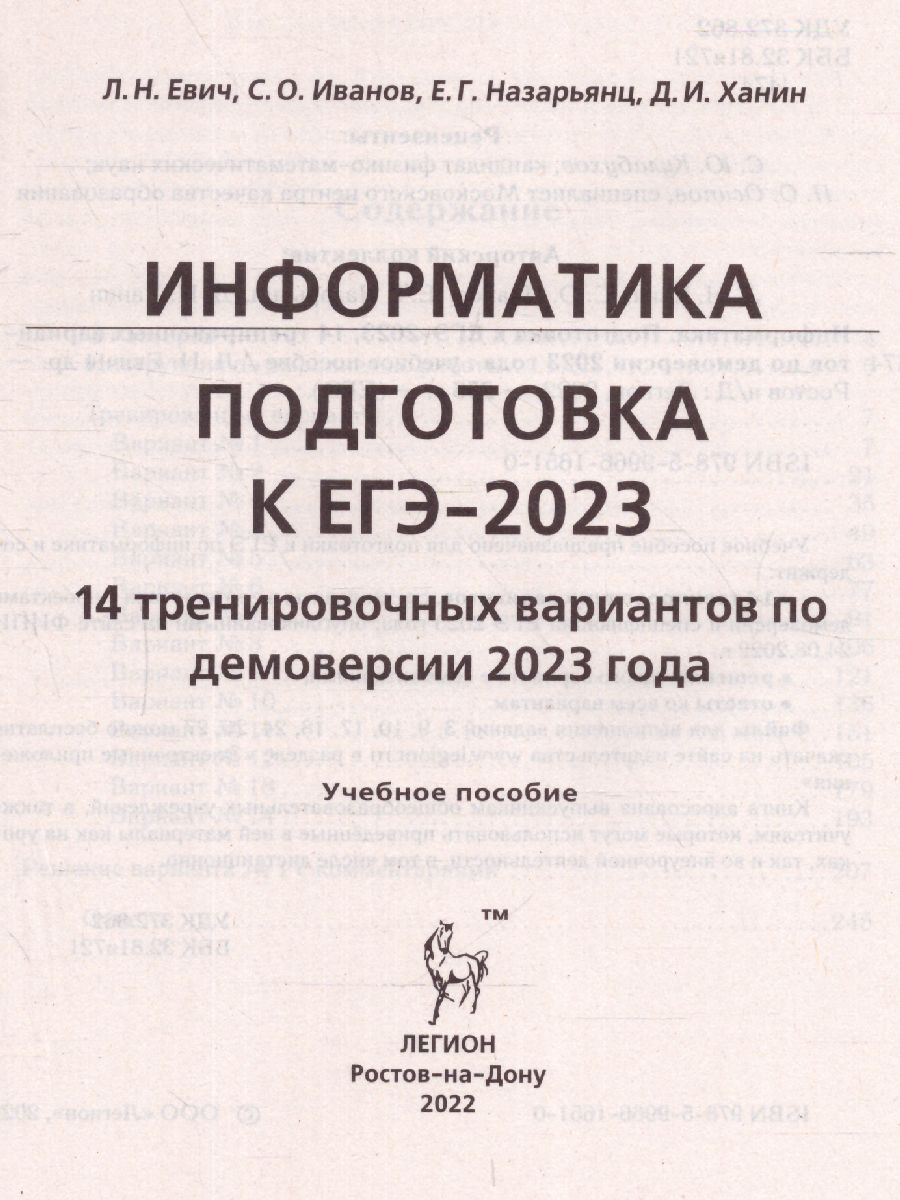 Подготовка к ЕГЭ-2023 Информатика. 14 тренировочных вариантов по демоверсии 2023 года. Информатика. Подготовка к ЕГЭ-2023. 14 тренировочных вариантов по демоверсии 2023 года. Учебное пособие предназначено для подготовки к ЕГЭ по информатике и содержит: 14 тренировочных вариантов, составленных в соответствии с проектами демоверсии и спецификации ЕГЭ 2023 года, опубликованными на сайте ФИПИ 24.08.2022 г.: решение одного варианта с комментариями: ответы ко всем вариантам. Файлы для выполнения заданий 3, 9, 10, 17, 18, 24, 26, 27 можно бесплатно скачать на сайте издательства в разделе "Электронные приложения". Книга адресована выпускникам общеобразовательных учреждений, а также учителям, которые могут использовать приведённые в ней материалы как на уроках, так и во внеурочной деятельности, в том числе дистанционно.Характеристики