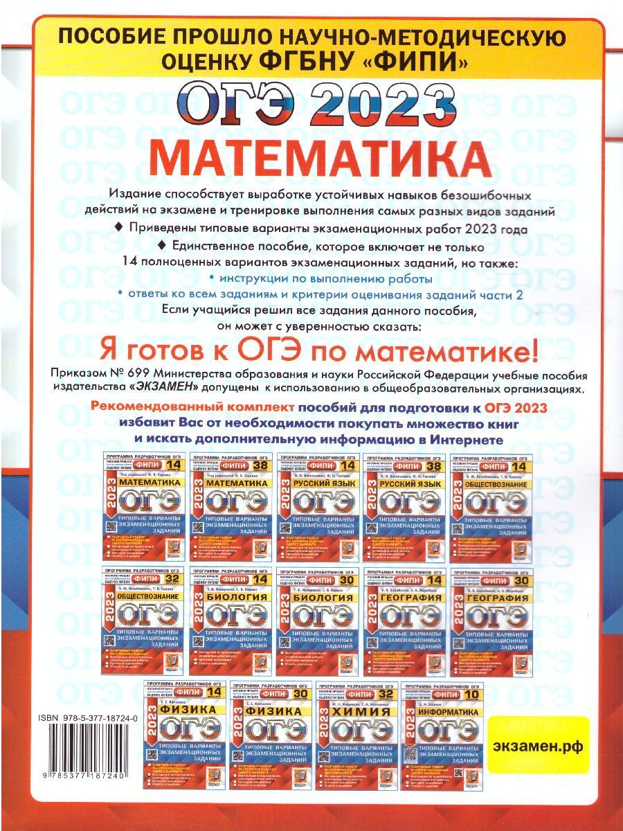 ОГЭ 2023 Математика. 14 вариантов. Типовые варианты экзаменационных заданий. ФИПИ. Пособие прошло научно-методическую оценку ФГБНУ "ФИПИ". Пособие содержит 14 типовых вариантов экзаменационных заданий Основного государственного экзамена по математике. Назначение пособия - предоставить возможность обучающимся отработать навыки выполнения заданий, аналогичных заданиям, представленным в демонстрационной версии ОГЭ по математике. Пособие адресовано учителям для подготовки учащихся к Основному государственному экзамену, а учащимся-девятиклассникам - для самоподготовки и самоконтроля.Характеристики