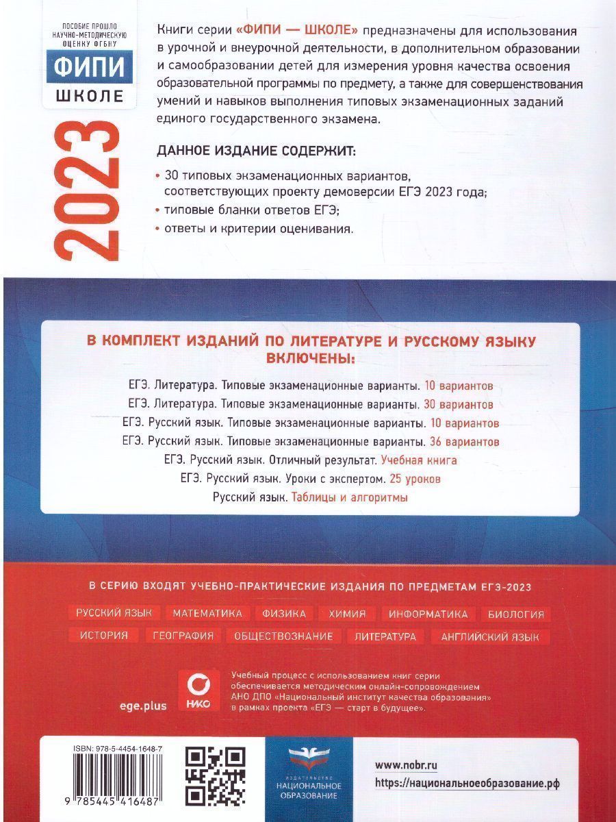 Набор из 3 штук ЕГЭ 2023. Математика, Русский язык, Литература. ЕГЭ 2023. Математика. Базовый уровень: типовые экзаменационные варианты: 30 вариантов. Серия подготовлена разработчиками контрольных измерительных материалов (КИМ) единого государственного экзамена. В сборнике представлены: 30 типовых экзаменационных вариантов, составленных в соответствии с проектом демоверсии КИМ ЕГЭ по математике базового уровня 2023 года: инструкция по выполнению экзаменационной работы: ответы ко всем заданиям. ЕГЭ 2023. Русский язык: типовые экзаменационные варианты: 36 вариантов. Серия подготовлена разработчиками контрольных измерительных материалов (КИМ) единого государственного экзамена. В сборнике представлены материалы: 36 типовых экзаменационных вариантов, составленных в соответствии с проектом демоверсии КИМ ЕГЭ по русскому языку 2023 года: инструкция по выполнению экзаменационной работы: ответы ко всем заданиям: критерии оценивания. ЕГЭ 2023. Литература: типовые экзаменационные варианты: 30 вариантов. Серия подготовлена разработчиками контрольных измерительных материалов (КИМ) единого государственного экзамена. В сборнике представлены: 30 типовых экзаменационных вариантов, составленных в соответствии с проектом демоверсии КИМ ЕГЭ по литературе 2023 года: инструкция по выполнению экзаменационной работы: ответы ко всем заданиям: критерии оценивания. Выполнение заданий типовых экзаменационных вариантов предоставляет обучающимся возможность самостоятельно подготовиться к государственной итоговой аттестации в форме ЕГЭ, а также объективно оценить уровень своей подготовки к экзамену.Характеристики