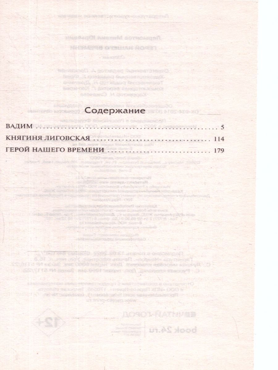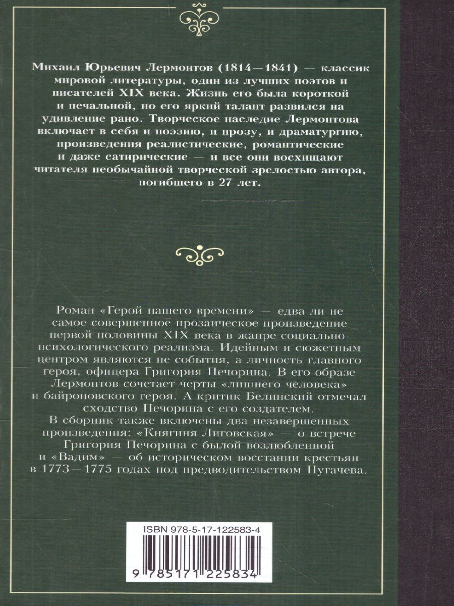 Герой нашего времени. Роман "Герой нашего времени" - едва ли не самое совершенное прозаическое произведение первой половины ХIХ века в жанре социально-психологического реализма. Идейным и сюжетным центром являются не события, а личность главного героя, офицера Григория Печорина. В его образе Лермонтов сочетает черты "лишнего человека" и байроновского героя. А критик Белинский отмечал сходство Печорина с его создателем. В сборник также включены два незавершенных произведения: "Княгиня Лиговская" - о встрече Григория Печорина с былой возлюбленной и "Вадим" - об историческом восстании крестьян в 1773-1775 годах под предводительством Пугачева.Характеристики