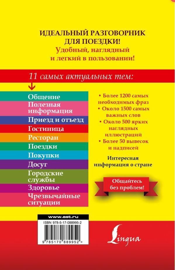 Английский визуальный разговорник станет вашим надежным спутником в поездке за границу. В нем вы найдете все самые необходимые фразы для наиболее часто встречающихся ситуаций: он поможет в гостинице, магазине, ресторане, при поездках в общественном транспорте, при осмотре достопримечательностей, при обращении к врачу, в полицию и т.п. Все фразы снабжены практической транскрипцией, передающей звуки английского языка средствами русской графики. Каждая тема дополнена яркими наглядными иллюстрациями, благодаря которым вы сможете объясниться без слов – просто покажите картинку собеседнику! Разговорник подходит всем, кто отправляется в туристическую или деловую поездку. Приятного путешествия!Характеристики