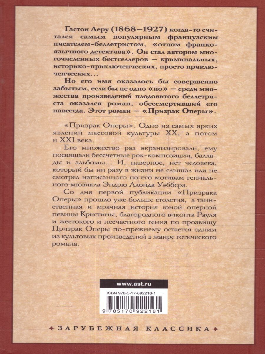 "Призрак Оперы". Одно из самых ярких явлений массовой культуры ХХ, а потом и XXI века. Его множество раз экранизировали, ему посвящали бессчетные рок-композиции, баллады и альбомы... И, наверное, нет человека, который бы ни разу в жизни не слышал или не смотрел написанного по его мотивам гениального мюзикла Эндрю Ллойда Уэббера. Со дня первой публикации "Призрака Оперы" прошло уже больше столетия, а таинственная и мрачная история юной оперной певицы Кристины, благородного виконта Рауля и жестокого и несчастного гения по прозвищу "Призрак Оперы" по-прежнему остается одним из культовых произведений в жанре "готического романа".Характеристики
