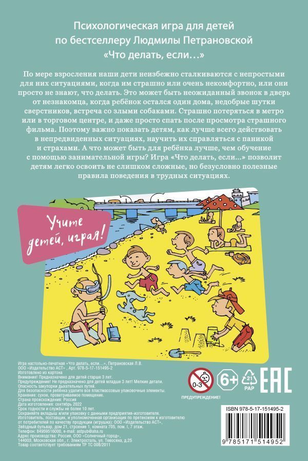 Психологическая игра Людмилы Петрановской по бестселлеру "Что делать, если…" Каждый день дети сталкиваются с препятствиями. Им бывает страшно или они просто не знают, что делать. А родители не всегда могут быть рядом. Настольная игра "Что делать, если…" научит детей самостоятельно справляться с трудностями, а также даст возможность весело провести время в кругу семьи. А что может быть для ребенка лучше, чем обучение с помощью занимательной игры? Игра рассчитана на компанию от 2-3 человек. В комплект входят: - книга "Что делать, если…" с правилами игры - 48 карт "Ситуация" - 96 карт "Решение" Взрослые могут играть с детьми вместе. Учите детей, играя! Прекрасное времяпрепровождение всей семьёй! Материал: картон. Благодаря игре «Что делать, если...» дети смогут научиться принимать правильные решения и поймут, как можно справляться со своими страхами, потренируют смекалку и попробуют без предварительной подготовки проверить свое умение быстро реагировать в сложных ситуациях. Игра рассчитана на детей 5–6 лет.Характеристики