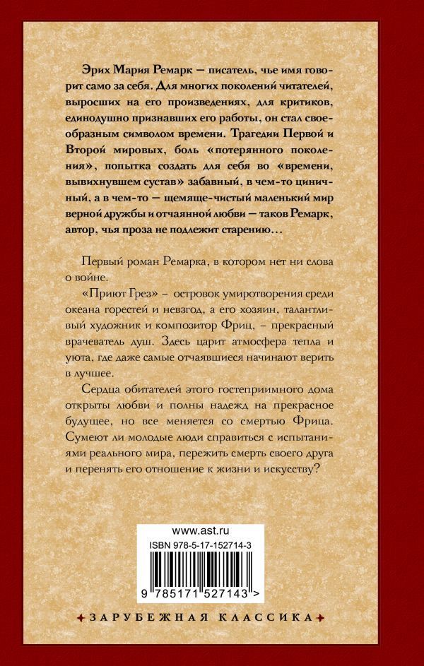 Первый роман Ремарка, в котором нет ни слова о войне. "Приют Грез" – островок умиротворения среди океана горестей и невзгод, а его хозяин, талантливый художник и композитор Фриц, – прекрасный врачеватель душ. Здесь царит атмосфера тепла и уюта, где даже самые отчаявшиеся начинают верить в лучшее. Сердца обитателей этого гостеприимного дома открыты любви и полны надежд на прекрасное будущее, но все меняется со смертью Фрица. Сумеют ли молодые люди справиться с испытаниями реального мира, пережить смерть своего друга и перенять его отношение к жизни и искусству? Роман публикуется в новом переводе.Характеристики