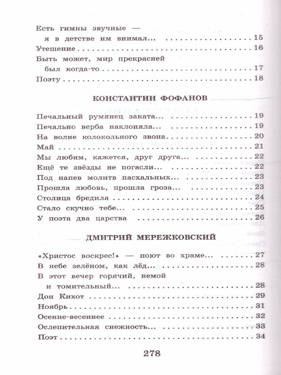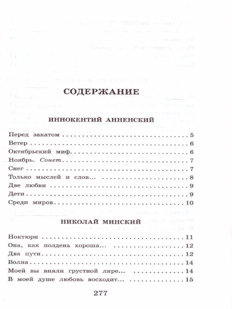 Серебряный век — образное название в истории русской поэзии конца XIX — начала ХХ века. Это была "одна из самых утончённых эпох в истории русской культуры, эпоха творческого подъёма и философии". Так писал русский философ Н.А. Бердяев, который и дал название этому периоду культуры и искусства. Первые десятилетия ХХ века — сложная и страшная страница в истории России — эпоха войн и революций. "Русскими душами овладели предчувствия надвигающихся катастроф. Поэты видели не только зори, но и что-то страшное, надвигающееся на Россию и мир…" Поэзия серебряного века вобрала в себя античную мифологию, библейскую историю, богатый опыт европейской и мировой литературы; теснейшим образом связана с русским фольклором, его песнями, плачами, сказаниями и частушками. В книгу вошли стихотворения и поэмы русских поэтов Серебряного века разных поэтических направлений и течений: И. Анненского, К. Фофанова, Д. Мережковского, К. Бальмонта, В. Брюсова, А. Блока, А. Ахматовой, О. Мандельштама, М. Цветаевой и др.Характеристики