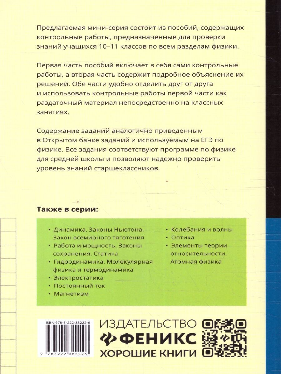 Данное пособие содержит контрольные работы, предназначенные для проверки знаний учащихся 10-11 классов по разделу "Кинематика". Пособие разделено на 2 части. Первая часть включает в себя сами контрольные работы, а вторая содержит подробное объяснение их решений. Обе части удобно отделить друг от друга и использовать контрольные работы первой части как раздаточный материал непосредственно на классных занятиях. Каждая из 6 тем раздела "Кинематика" включает в себя 5 контрольных работ, состоящих из 10 заданий разного уровня трудности. Их содержание аналогично приведенным в Открытом банке заданий и используемым на ЕГЭ по физике. Если уроки по физике спаренные, как это имеет место в наукоемких лицеях и гимназиях естественно-научного профиля, то учитель может предлагать учащимся решить контрольную работу полностью, а на обычном 45-минутном уроке достаточно решения половины заданий по выбору учителя. Все задания соответствуют программе по физике для средней школы и позволяют надежно проверить уровень знаний старшеклассников. Пособие будет полезно старшеклассникам, абитуриентам и репетиторам. Пособие окажет большую помощь учителю при подготовке и проведении проверки знаний учащихся на контрольных работах, зачетах, семинарах и экзаменах.Характеристики