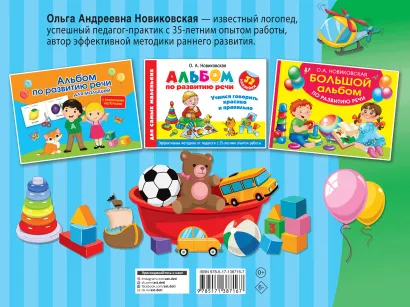 "Альбом по развитию речи для малышей" — это сборник развивающих заданий для самых маленьких. • Много весёлых и познавательных игр. • Артикуляционные упражнения для губ, щёк и языка особенно необходимы детям, у которых отмечается задержка речевого развития. • Упражнения по различению близких по звучанию слогов, игры для развития речевого слуха и чувства ритма. • Упражнения, которые помогут выработать у малышей умеренный темп речи, благодаря которым речь станет более чёткой и внятной.Артикуляционные упражнения, дыхательная и голосовая гимнастика, пальчиковые игры — всё это поможет малышам развить речь, расширить активный и пассивный словарный запас, сформировать чёткую и выразительную дикцию.Характеристики