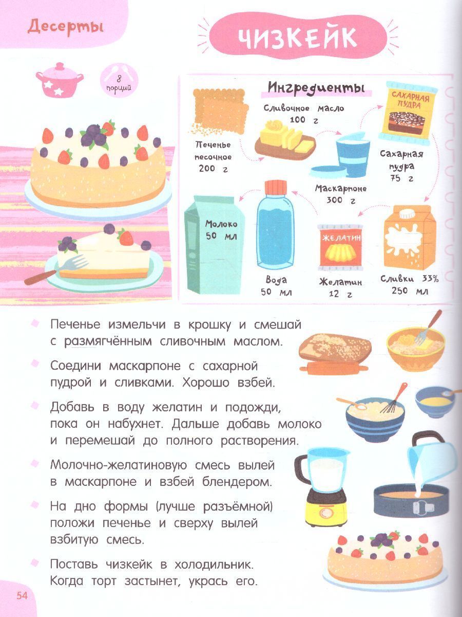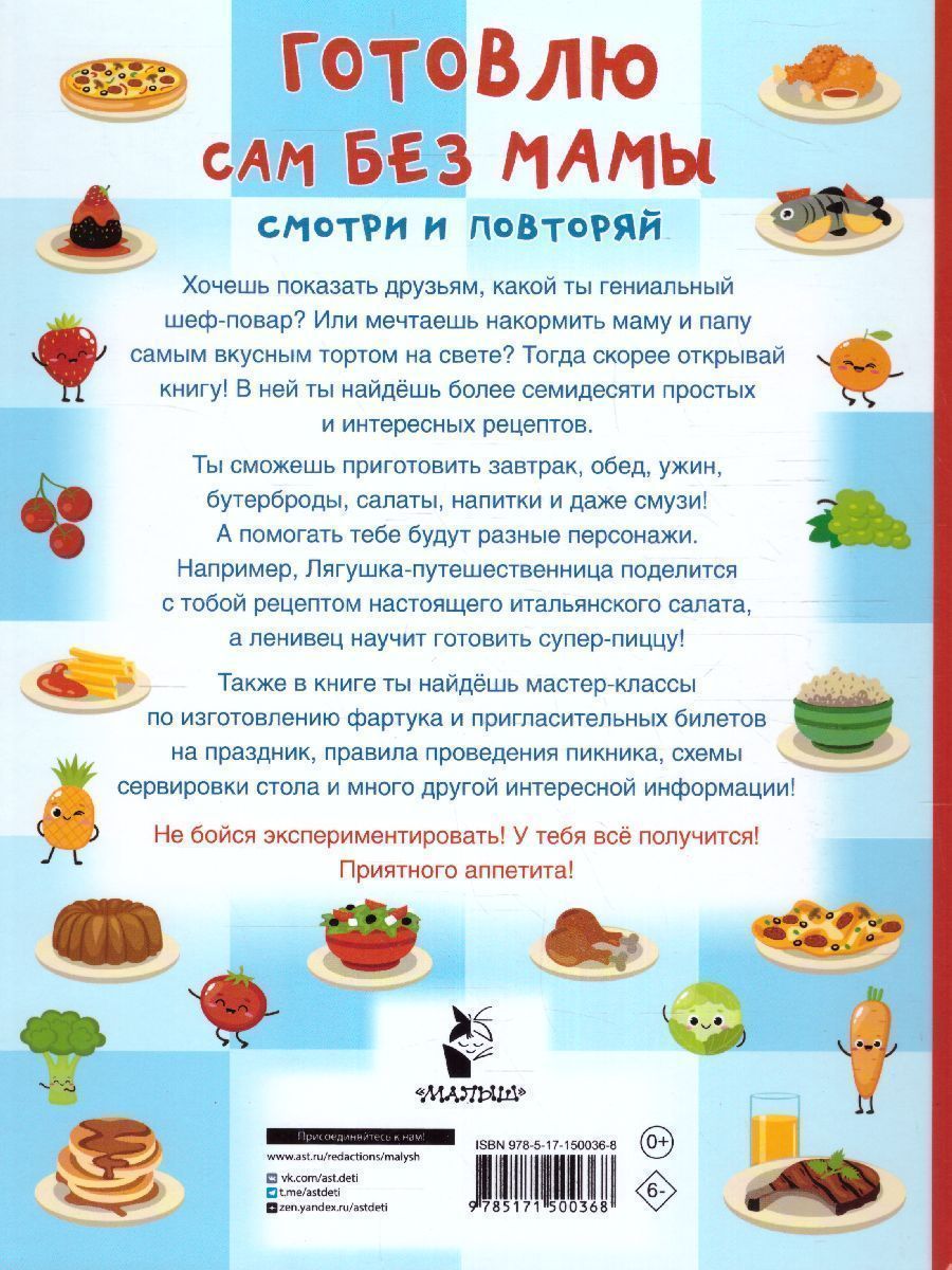 Кулинарная книга «Готовлю сам без мамы» содержит более 70 разнообразных рецептов. Умение готовить – это не просто полезный навык, но и воспитание в ребёнке самостоятельности и ответственности. Каждое приготовленное блюдо – новая ступенька в обретении ребенком уверенности и осознании собственной ценности. Яркие иллюстрации, выполненные в стиле современных мультфильмов. Пошаговое описание простых, но привлекательных для детей блюд: завтраки, обеды, ужины, десерты, бутерброды, салаты, напитки, смузи. Понятные ребенку единицы измерения – стакан, чайная ложка.Характеристики