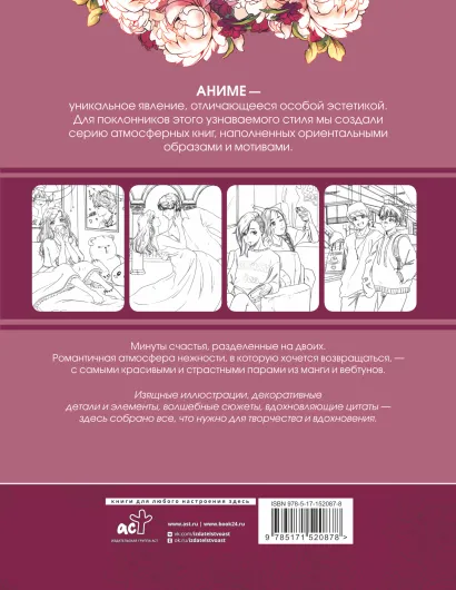 — Подарочные раскраски в стиле аниме и манга! — Японская эстетика раскрывается в изображениях высокого качества. А на каждом развороте вдохновляющая цитата! — В Anime Art «Доказательство любви» воссоздана нежная атмосфера любимых романтических манг и вебтунов. — Изящные детали, кропотливый дизайн и волшебная атмосфера. Каждая раскраска — безграничный простор для творчества и воображения. — Подбирать цвета для церемониальных костюмов былых эпох и сказочных царств — удовольствие для любого фаната аниме.Характеристики