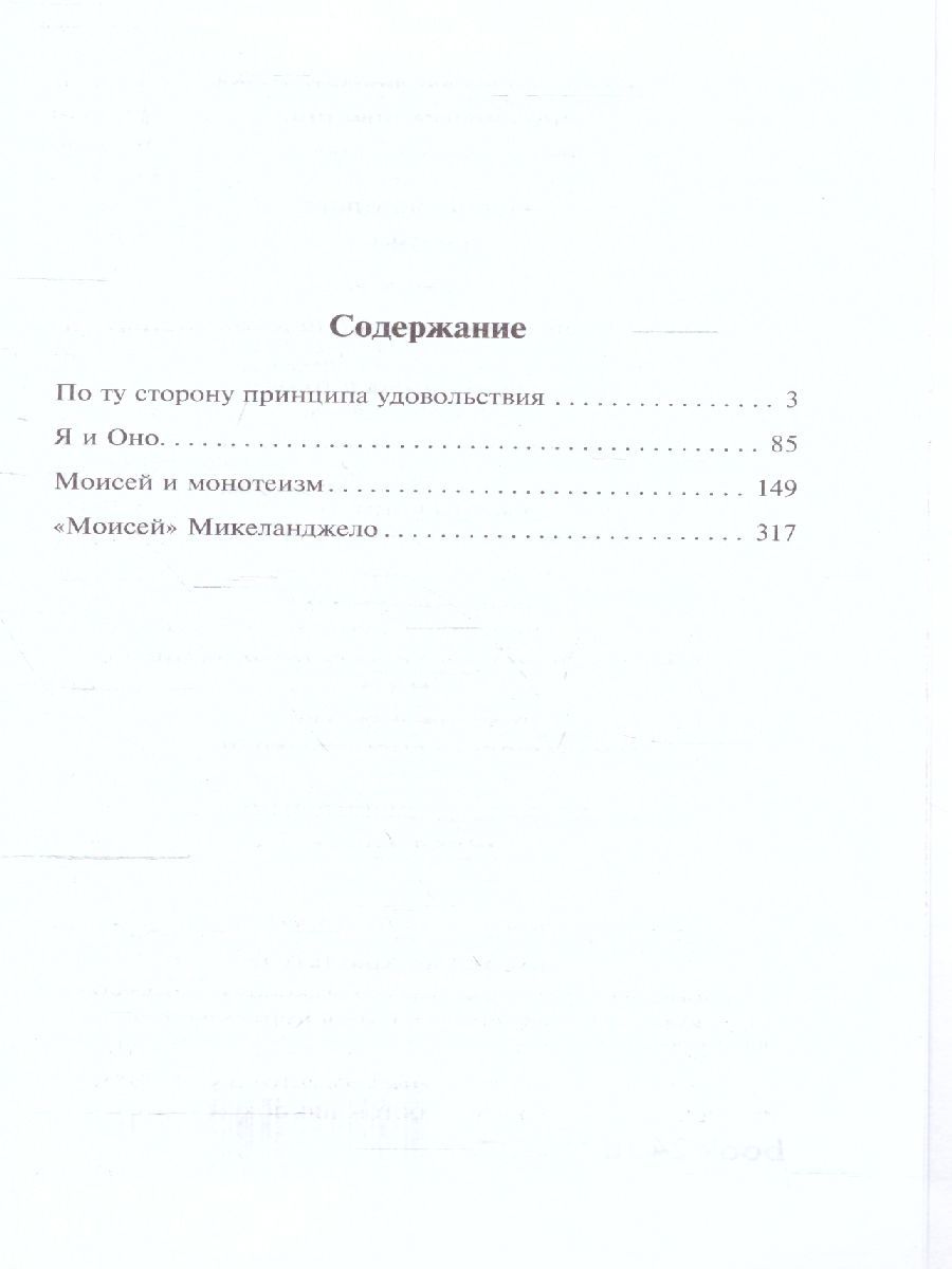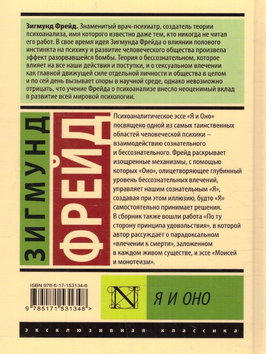 Психоаналитическое эссе "Я и Оно" посвящено одной из самых таинственных областей человеческой психики - взаимодействию сознательного и бессознательного. Фрейд раскрывает изощренные механизмы, с помощью которых "Оно", олицетворяющее глубинный уровень бессознательных влечений, управляет нашим сознательным "Я", создавая при этом иллюзию, будто "Я" самостоятельно принимает решения. В сборник также вошли работа "По ту сторону принципа удовольствия", в которой автор рассуждает о парадоксальном "влечении к смерти", заложенном в каждом живом существе, и эссе "Моисей и монотеизм".Характеристики