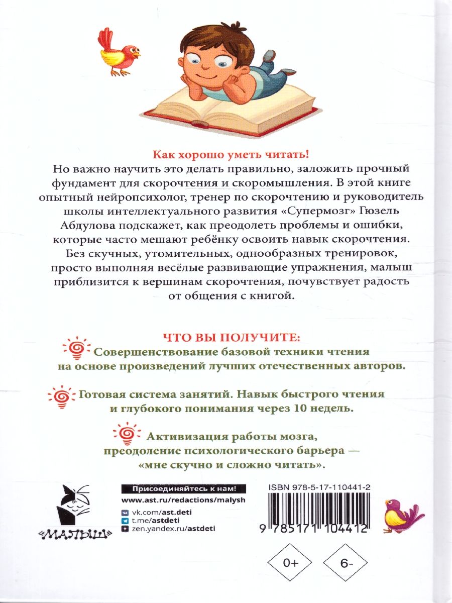 В этой книге опытный нейропсихолог, тренер по скорочтению и руководитель школы интеллектуального развития "Супермозг" Гюзель Абдулова подскажет, как преодолеть проблемы и ошибки, которые часто мешают ребёнку освоить навык скорочтения. Без скучных, утомительных, однообразных тренировок, просто выполняя весёлые развивающие упражнения, малыш приблизится к вершинам скорочтения, почувствует радость от общения с книгой. Для младшего школьного возраста.Характеристики