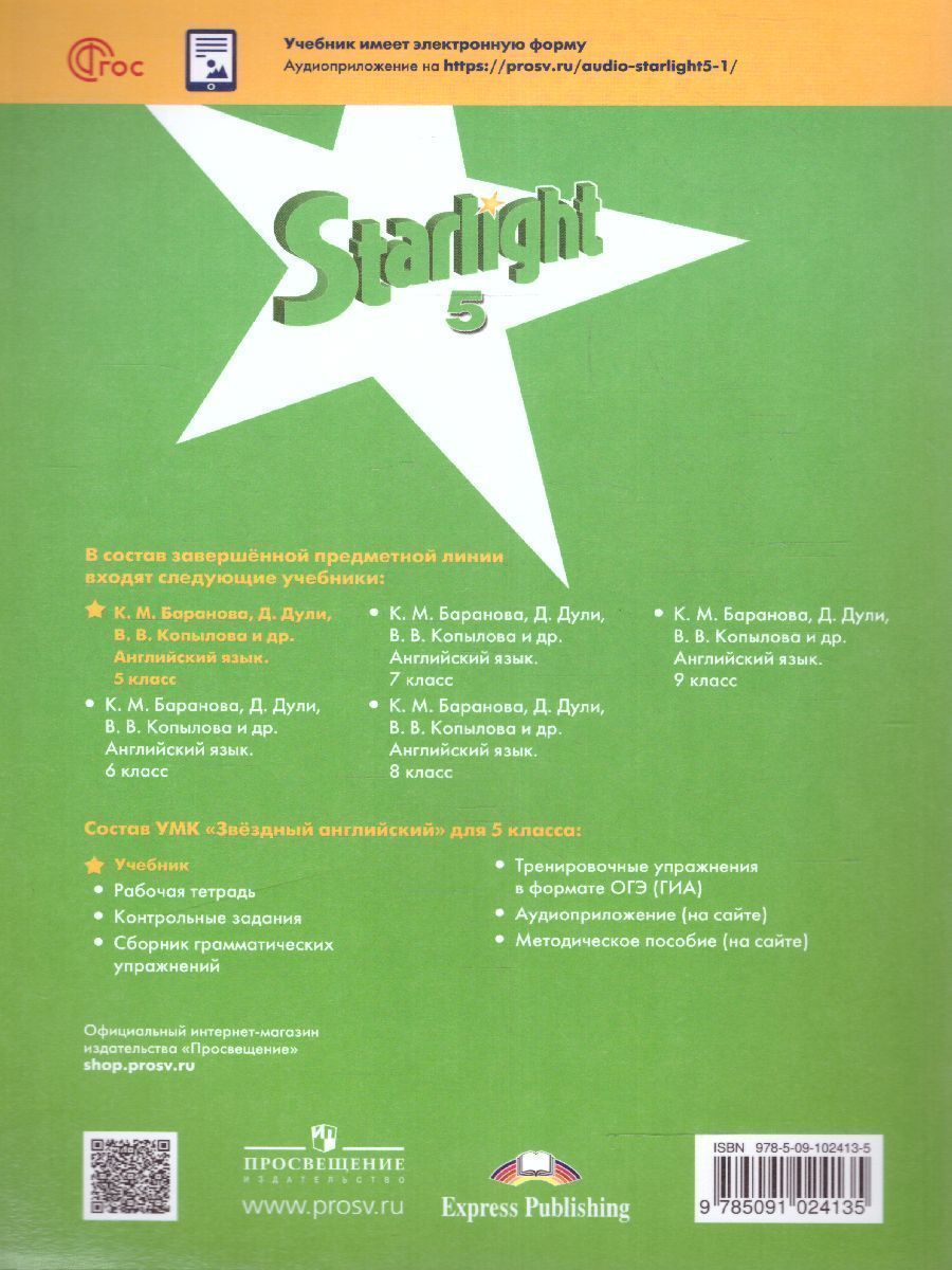 Учебник является центральным элементом учебно-методического комплекта серии "Звёздный английский" для учащихся 5 класса общеобразовательных организаций и школ с углублённым изучением английского языка. Отличительной особенностью УМК является модульное построение учебника, наличие аутентичного материала о России, заданий, соответствующих требованиям международных экзаменов, готовящих постепенно к Государственной итоговой аттестации в 9 классе. Материалы учебника способствуют достижению личностных, метапредметных и предметных результатов обучения. Учебник разработан в соответствии со всеми требованиями ФГОС ООО, утверждённого приказом Министерства просвещения № 287 от 31.05.2021. 13-е издание, переработанное.Характеристики
