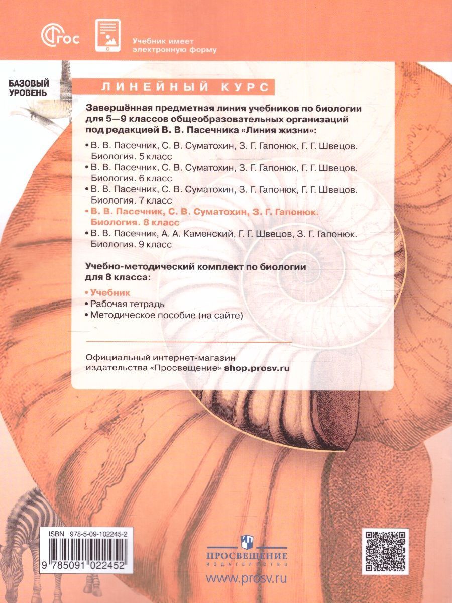 Биология 8 класс. Базовый уровень. Учебник к новому ФП, 2023 год. Линейный курс. УМК "Линия жизни". ФГОС. Учебник соответсвует ФГОС 2021 г. Предлагаемый учебник - основной элемент информационно-образовательной среды предметной линии УМК по биологии «Линия жизни» для 8 класса. В нём рассмотрено многообразие животного мира, биологические и экологические особенности организмов, их взаимодействие и эволюция. Учебник подготовлен в соответствии со всеми требованиями ФГОС ООО, утверждённого приказом Министерства просвещения № 287 от 31.05.2021 г. В связи с этим большое внимание уделено организации учебного материала в соответствии с разными формами учебной деятельности, а также формированию универсальных учебных действий учащихся. Разнообразие заданий и деятельностный блок «Моя лаборатория» позволяют отрабатывать широкий спектр необходимых умений и компетенций.Характеристики