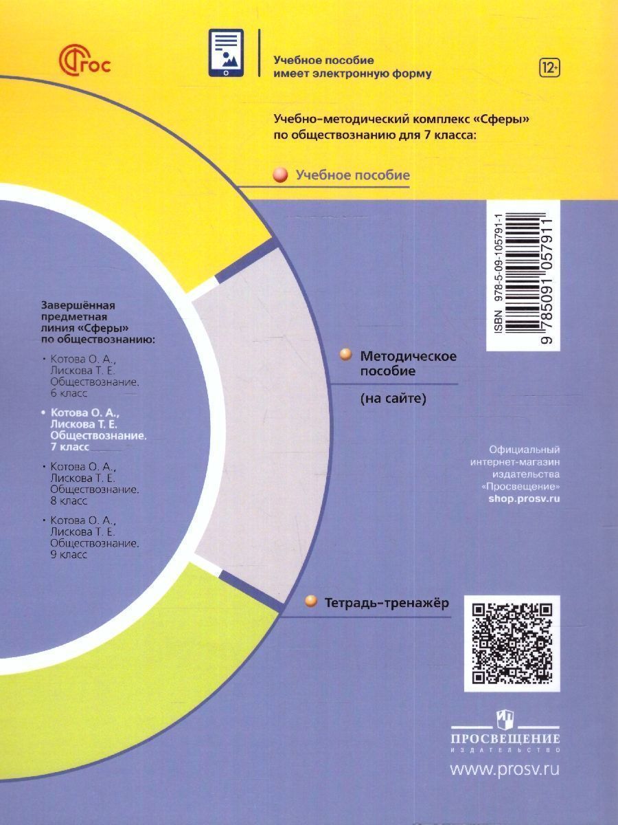 Обществознание 7 класс. Учебное пособие к новому ФП, 2023 год. УМК "Сферы". ФГОС. Учебное пособие подготовлено в соответствии со всеми требованиями ФГОС ООО, утверждённого Приказом Министерства просвещения № 287 от 31.05.2021 г. Учащиеся получат представление о регулировании поведения людей в обществе, о правах и свободах человека и системе их защиты, о гражданских, семейных, трудовых правоотношениях и юридической ответственности в России. Раздел курса призван способствовать формированию общегражданской российской идентичности молодого поколения России, толерантности, социальной ответственности, правовой, духовно-нравственной и политической культуры, самостоятельности, а также приверженности ценностям, закреплённым в Конституции Российской Федерации.Характеристики