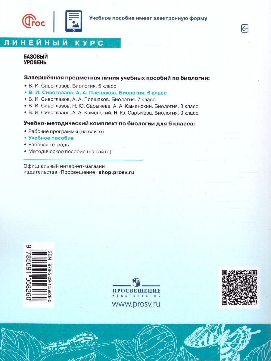 Биология 6 класс. Базовый уровень. Учебное пособие к новому ФП, 2023 год. ФГОС. Линия УМК: Биология. Сивоглазов В. И. (5-9) Линейный курс. Учебное пособие подготовлено в соответствии с требованиями Федерального государственного образовательного стандарта основного общего образования, утверждённого приказом Министерством просвещения № 287 от 31.05.2021 г. Учебное пособие является надёжным инструментом, помогающим в достижении образовательных результатов по биологии. Основной материал параграфов расширяет рубрика «Для любознательных», а методическая составляющая содержит систему заданий, которая позволяет отрабатывать широкий перечень умений и компетенций.Характеристики