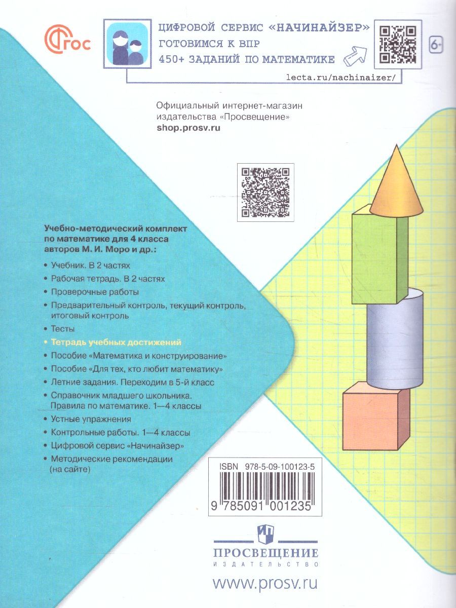 Математика 4 класс. Тетрадь учебных достижений (ФП2022). УМК "Школа России". ФГОС. Учебное пособие «Математика. Тетрадь учебных достижений. 4 класс» (авт. С. И. Волкова) подготовлено к учебнику «Математика. 4 класс» (авт. М. И. Моро, М. А. Бантова, Г. В. Бельтюкова и др.), доработанному в соответствии с требованиями Федерального государственного образовательного стандарта начального общего образования (Приказ Министерства просвещения РФ № 286 от 31.05.2021 г.). Материал пособия содержит инструменты для самопроверки, необходимые для обучения самостоятельному оцениванию успехов по предмету «Математика» в 4 классе: проверочные таблицы по каждой работе, по итогам каждого полугодия и по всему курсу математики начальных классов. Пособие поможет оценить уровень достижения предметных и метапредметных результатов обучения.Характеристики