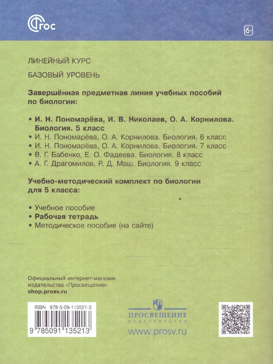Биология 5 класс (линейный курс). Базовый уровень. Рабочая тетрадь. УМК "Биология. Пономарева И.Н. (5-9) (Линейный курс)". (К новому ФП). ФГОС. Рабочая тетрадь является составной частью учебно-методического комплекта серии «Линия жизни» для 5 классов под редакцией В. В. Пасечника и адресована учащимся, занимающимся по учебнику этой линии. Структура пособия соответствует тематической структуре учебника «Биология. 5 класс. Базовый уровень» и содержит разнообразные вопросы и задания, направленные на отработку широкого спектра необходимых умений. В пособие также включены задания для контроля, которые помогут лучше подготовиться к проверке знаний. Пособие предназначено для самостоятельной работы учащихся дома или на уроке.Характеристики