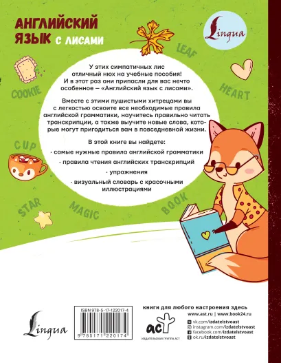 "Английский язык с лисами" — это не очередное скучное пособие, способное вызвать у вас зевоту. Это целое приключение, полное новых открытий, а симпатичные лисы, которые будут сопровождать вас на каждом этапе пути, сделают его еще более ярким. В книгу вошли все необходимые правила английской грамматики, правила чтения, а также визуальный словарь, который позволит вам освоить новые слова.Характеристики